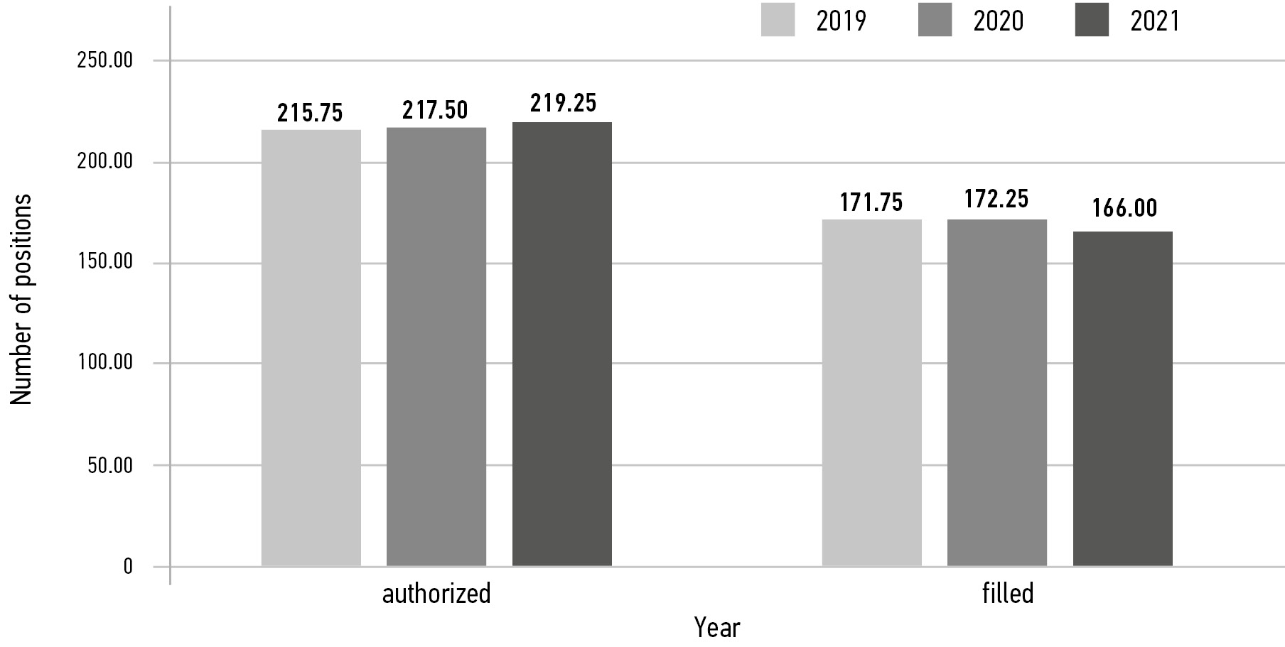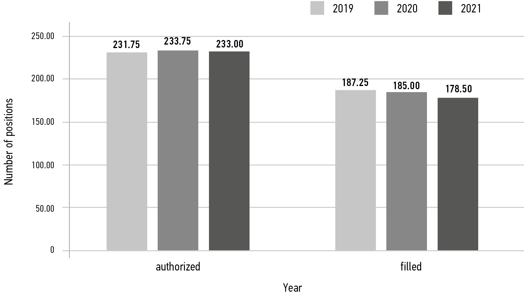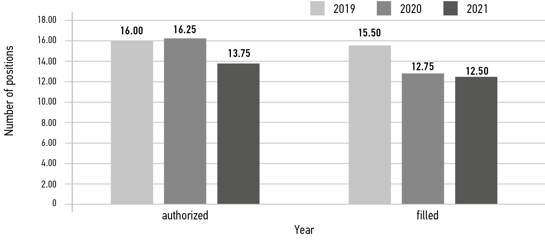 Fig. 2. Number of authorized and filled positions of oral surgeons in outpatient departments of state medical organizations of the Krasnodar Territory, 2019–2021.