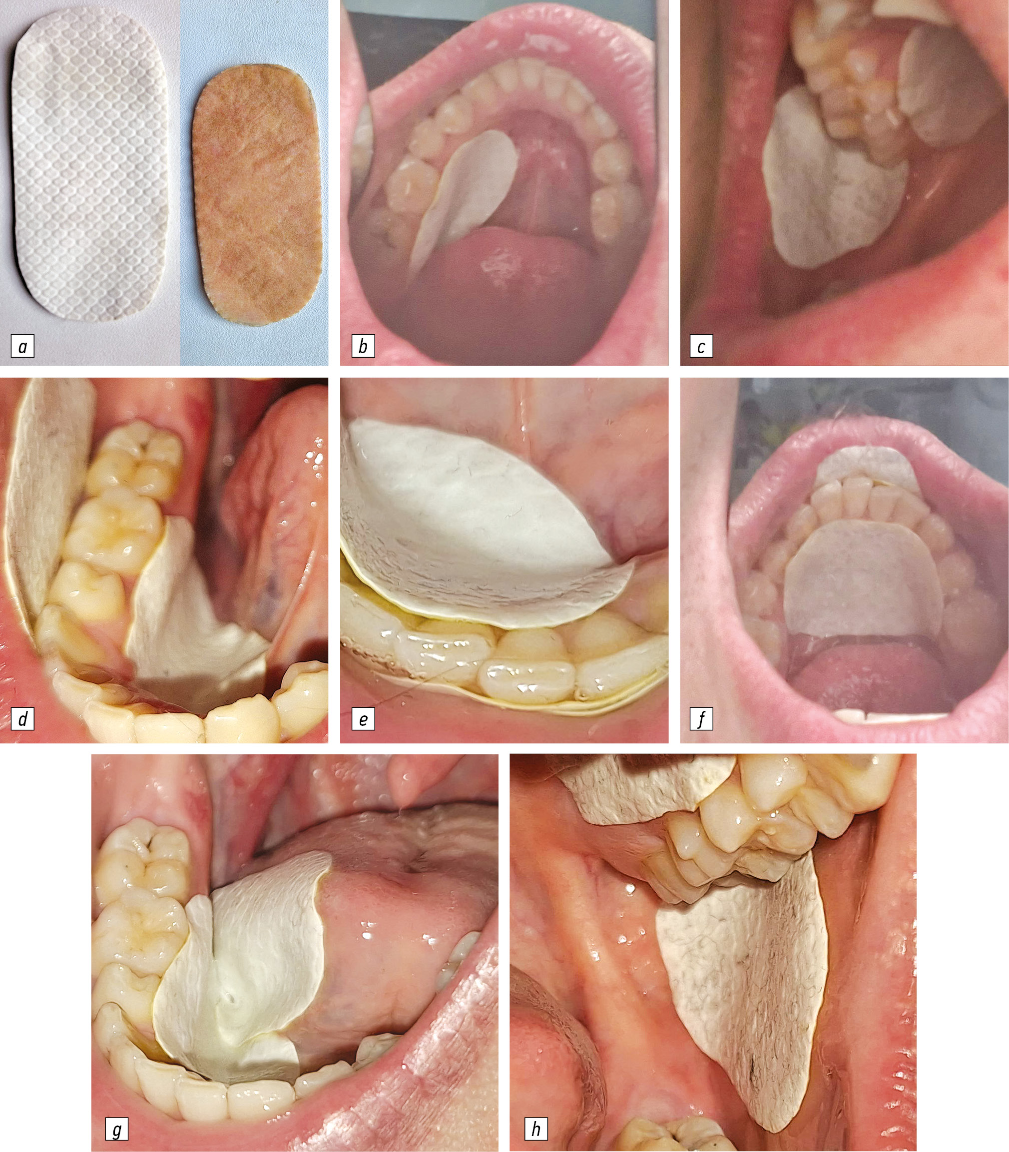 Fig. 1. Protective dental pad designed to protect the oral mucosa (smooth side to the mucous membrane) — a (general view), located during preparation: b — on the alveolar process on the lingual side to protect the 3.6 tooth; c — on the cheek and palatine surface of the alveolar process to protect tooth 1.7; d — on the cheek and lingual surface of the alveolar process to protect the tooth 4.6; e — on the lingual and vestibular surfaces of the alveolar process to protect teeth 3.2, 3.1, 4.1, 4.2; f — on the lingual and vestibular surface of the alveolar process to protect teeth 3.5, 3.4, 3.3., 3.2, 3.1, 4.1, 4.2, 4.3, 4.4; g — on the lingual surface of the alveolar process and on the tongue to protect the tooth 4.6; h — on the cheek and palatine surface of the alveolar process to protect the tooth 2.5, 2.6.