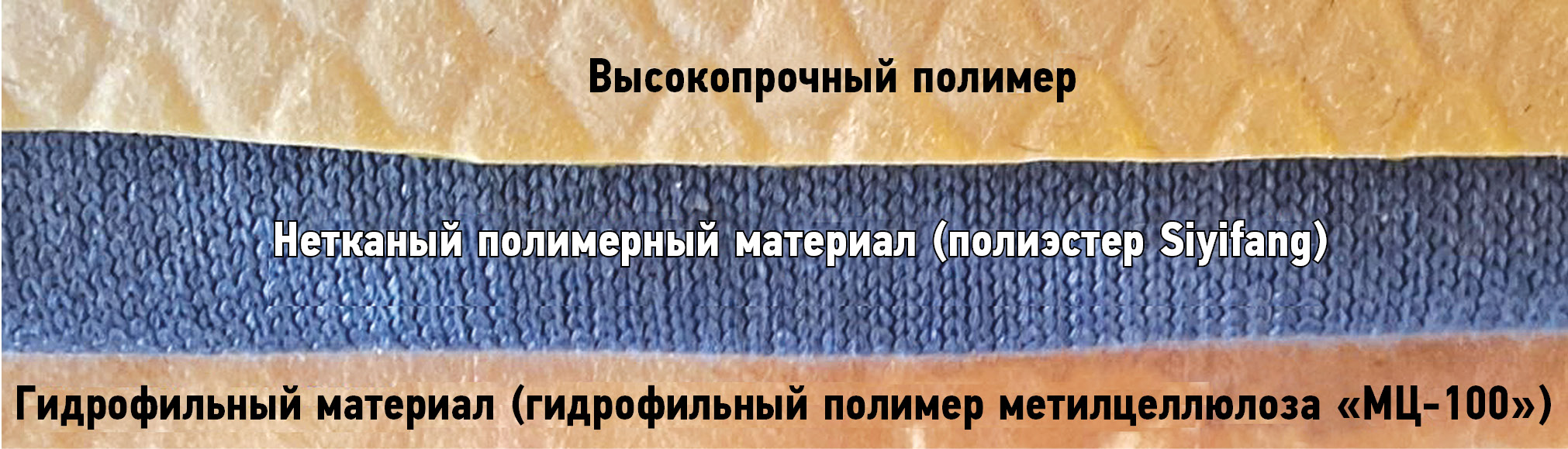 Рис. 2. Структура стоматологической накладки, предназначенной для защиты слизистой оболочки полости рта, сверху вниз: наружный слой из высокопрочного полимера; средний стой из нетканого полимерного материала, полиэстера Siyifang (Cordura Oxford fabric, Китай); внутренний слой из гидрофильного материала «МЦ-100» (Defy, Россия), соединённых между собой клеем Technomelt PS 1540 (Henkel adhesives, Германия).