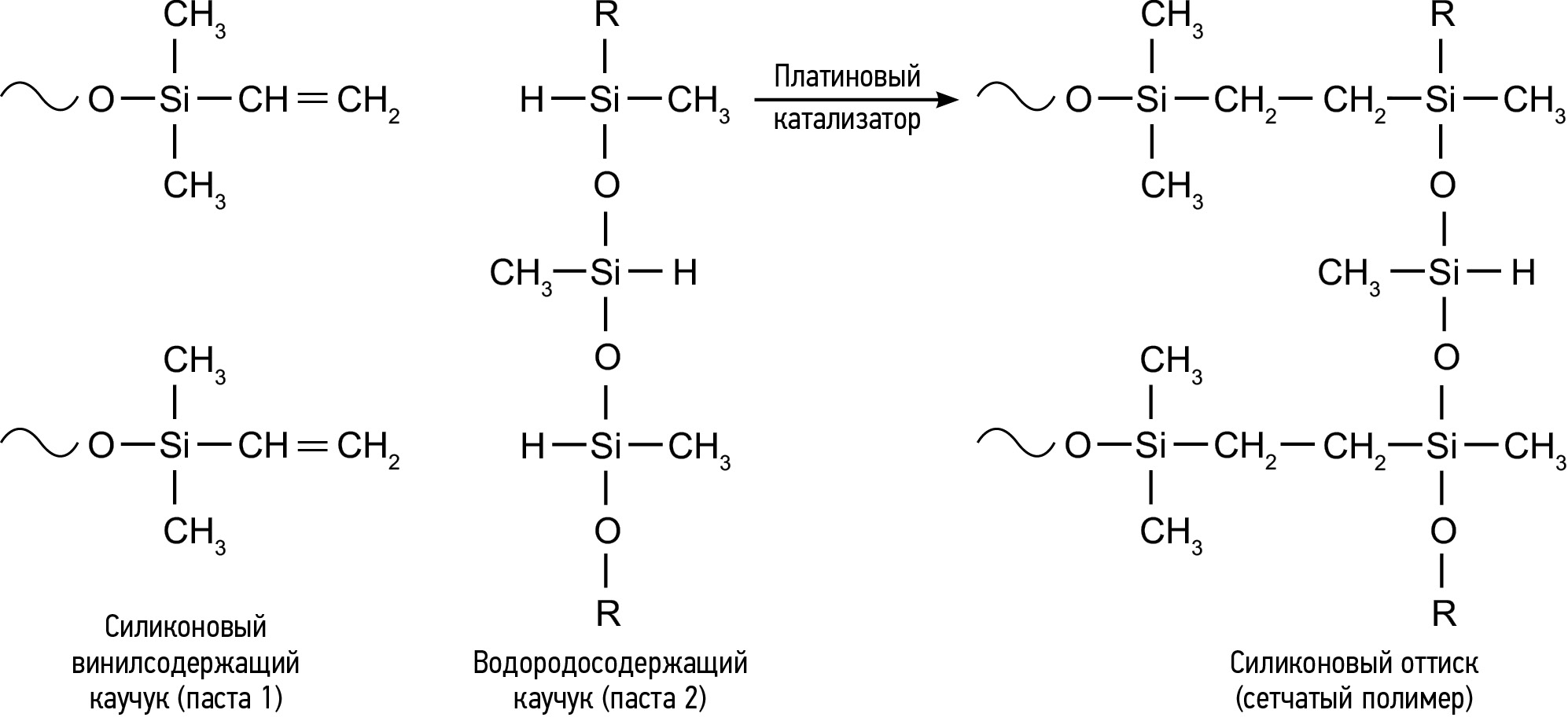 По типу химической реакции вулканизации силиконовые материалы подразделяют на полимеризационные — I типа — (рис. 2) и поликонденсационные. У полимеризационных силиконовых материалов реакция полимеризации осуществляется без появления побочных продуктов. Полимеризационным силиконовым материалам свойственны высокий уровень точности отображения тканей протезного ложа и низкий уровень усадки [11, 12].