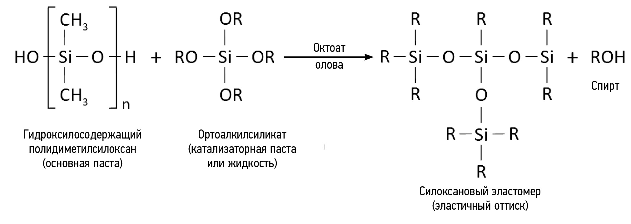 Формирование оттисков из поликонденсационных силиконов — II типа — (рис. 3) происходит с помощью реакции поликонденсации, которая сопровождается выделением низкомолекулярных побочных продуктов [12].