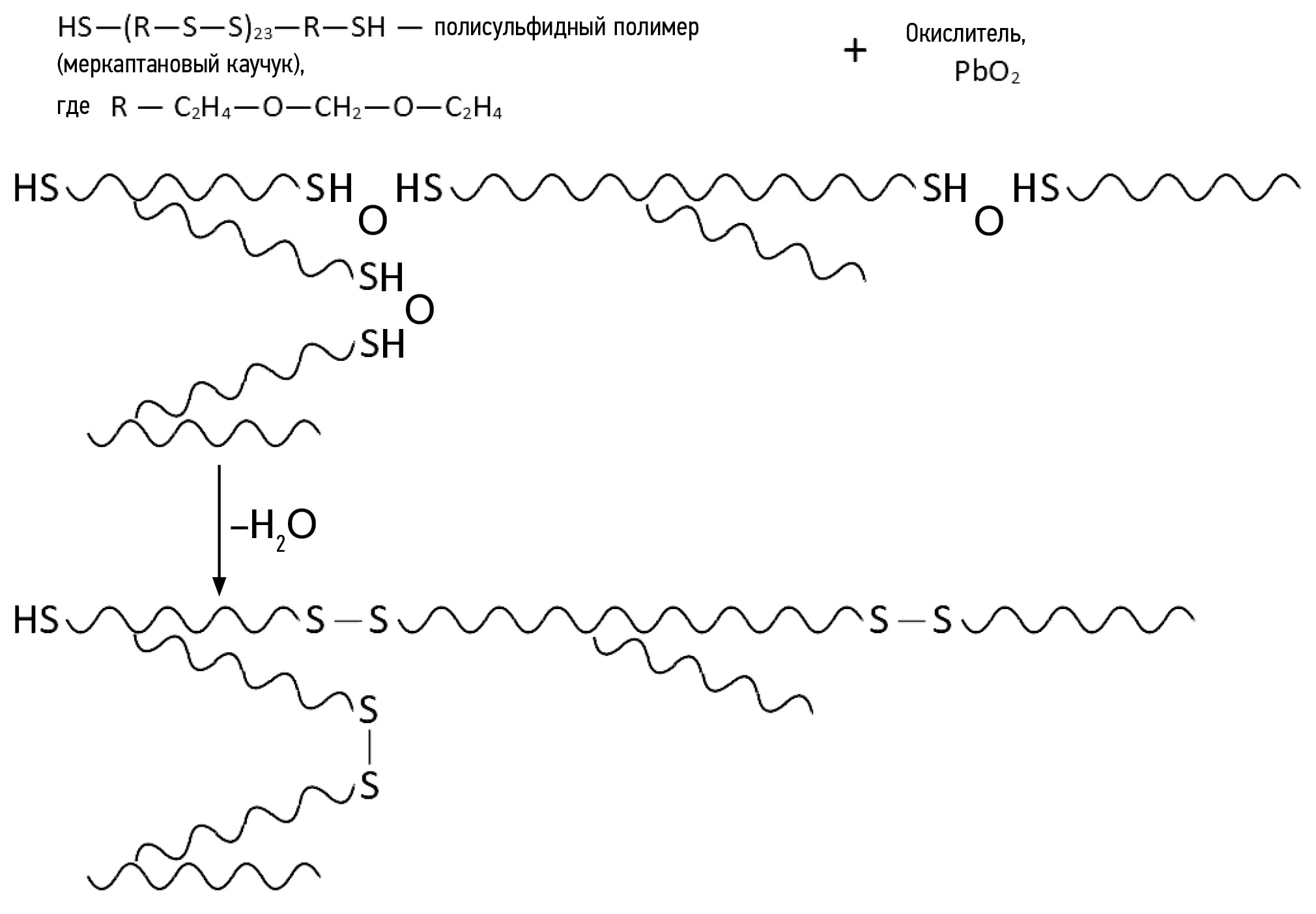 Эти массы производят в виде основной и катализаторной паст. Структурной единицей основной пасты является полисульфидный или меркаптановый каучук, а катализаторная паста выполняет роль окислителя. Следует отметить, что наиболее часто в качестве окислителя применяют диоксид свинца (рис. 6) [24, 25].