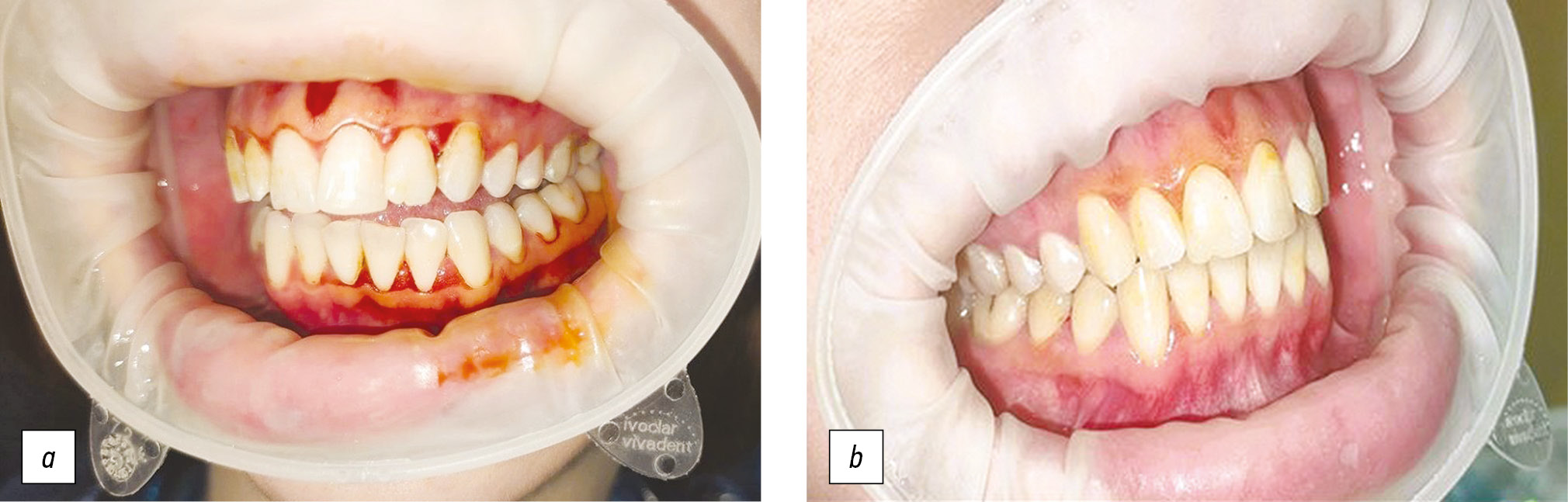 The patient was examined in accordance with the 2018 clinical guidelines of the Russian Dental Association [9]. Oral hygiene status was assessed using the following indices: Simplified Oral Hygiene Index (OHI-S), Patient Hygiene Performance Index (PHP), and Approximal Plaque Index (API). The severity of gingival inflammation was evaluated using the Papillary-Marginal-Alveolar Index (PMA), Sulcus Bleeding Index (SBI), and Gingival Index (GI) (see Fig. 1). The index scores were as follows: OHI-S = 2.33; PHP = 3.5; API = 78.57%; PMA = 47.62%; SBI = 67.86%; GI = 1.5. These values indicate poor oral hygiene, moderate inflammation in the periodontal tissues, and moderate gingivitis.