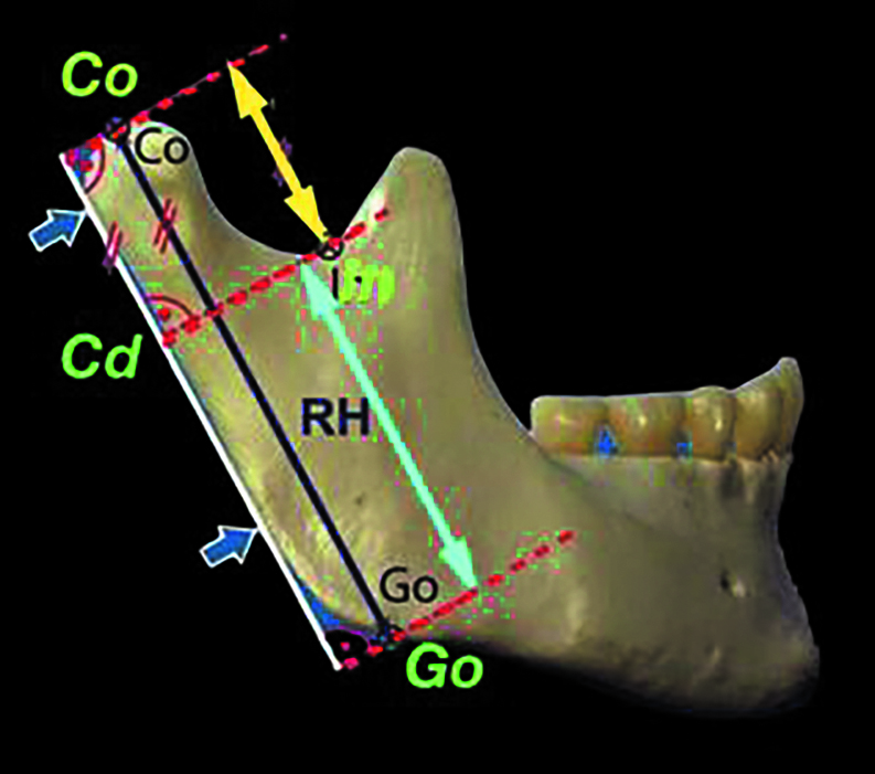 Рис. 2. Измерение длины ветви нижней челюсти и высоты мыщелкового отростка (Go-Cd и In-Co) по касательной к заднему краю ветви нижней челюсти.