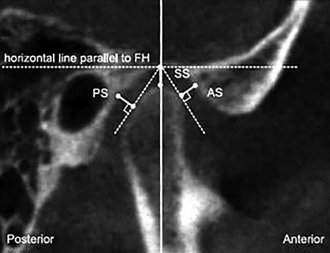 При измерении параметров пациентов с гнатической формой мезиальной окклюзии и асимметрией нижней челюсти не было выявлено значительной разницы между величинами переднего (AS) и заднего суставного пространств (PS) [6].