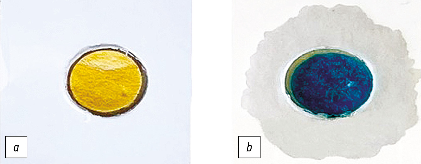 The rapid urease test Helicobacter-test was used to detect HP in parotid saliva. For this purpose, a drop of saliva obtained during PSG sialometry was placed on an indicator disk with a diameter of 6 mm (Fig. 3). Blue staining observed within 3 minutes indicated high urease activity and was classified as HP-positive.