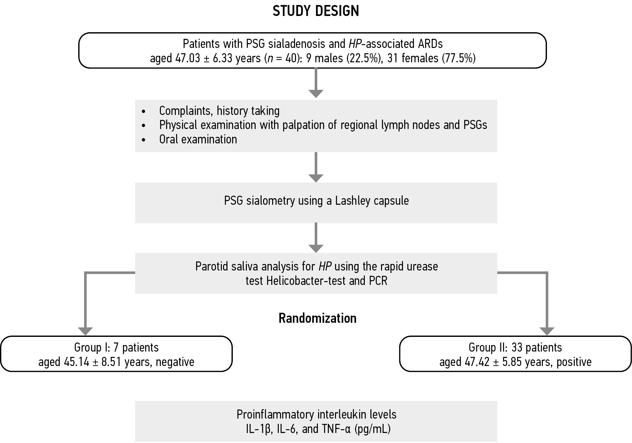 MATERIALS AND METHODS: The study included 40 patients aged 47.03±6.33 years with sialadenosis of parotid salivary glands and HP-associated gastrointestinal diseases diagnosed by immunochromatographic antigenic test using fecal samples and enzyme immunoassay of blood serum for anti-H. pylori IgG before eradication treatment. All patients underwent a comprehensive examination including basic tests (collection of complaints, anamnesis data, external examination and palpation of the regional lymph nodes and salivary glands, oral cavity examination), sialometry, express test (Helicobacter test), polymerase chain reaction diagnostics of parotid salivary gland secretion for HP, and measurement of proinflammatory cytokine levels (interleukin-1β and interleukin-6, and tumor necrosis factor-α in pg/mL). Patients with sialadenosis of the parotid salivary glands depending on HP detection in parotid secretions were divided into groups I (n=7, aged 45.14±8.51 years, negative) and II (n=33, aged 47.42±5.85 years, positive). The control group included 20 practically healthy people aged 45.40±6.54 years.