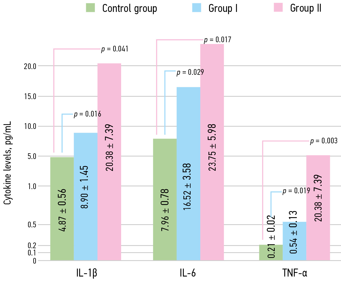 Thus, patients in Group I with PSG sialadenosis and HP-negative parotid saliva had early-stage xerostomia. Reduced secretory function of PSGs in study participants indicates a reactive aseptic process associated with a 2.6-fold (p = 0.019) and 1.8-fold (p = 0.016) increase in TNF-α and IL-1β levels, respectively, compared to the control group (Fig. 5). Proinflammatory interleukins promoted chemotaxis and facilitated neutrophil and macrophage migration, which increased inflammation [7, 8, 10]. A 2.1-fold increase in IL-6 levels (p = 0.029) (Fig. 5) indicated a chronic disorder [7–10].