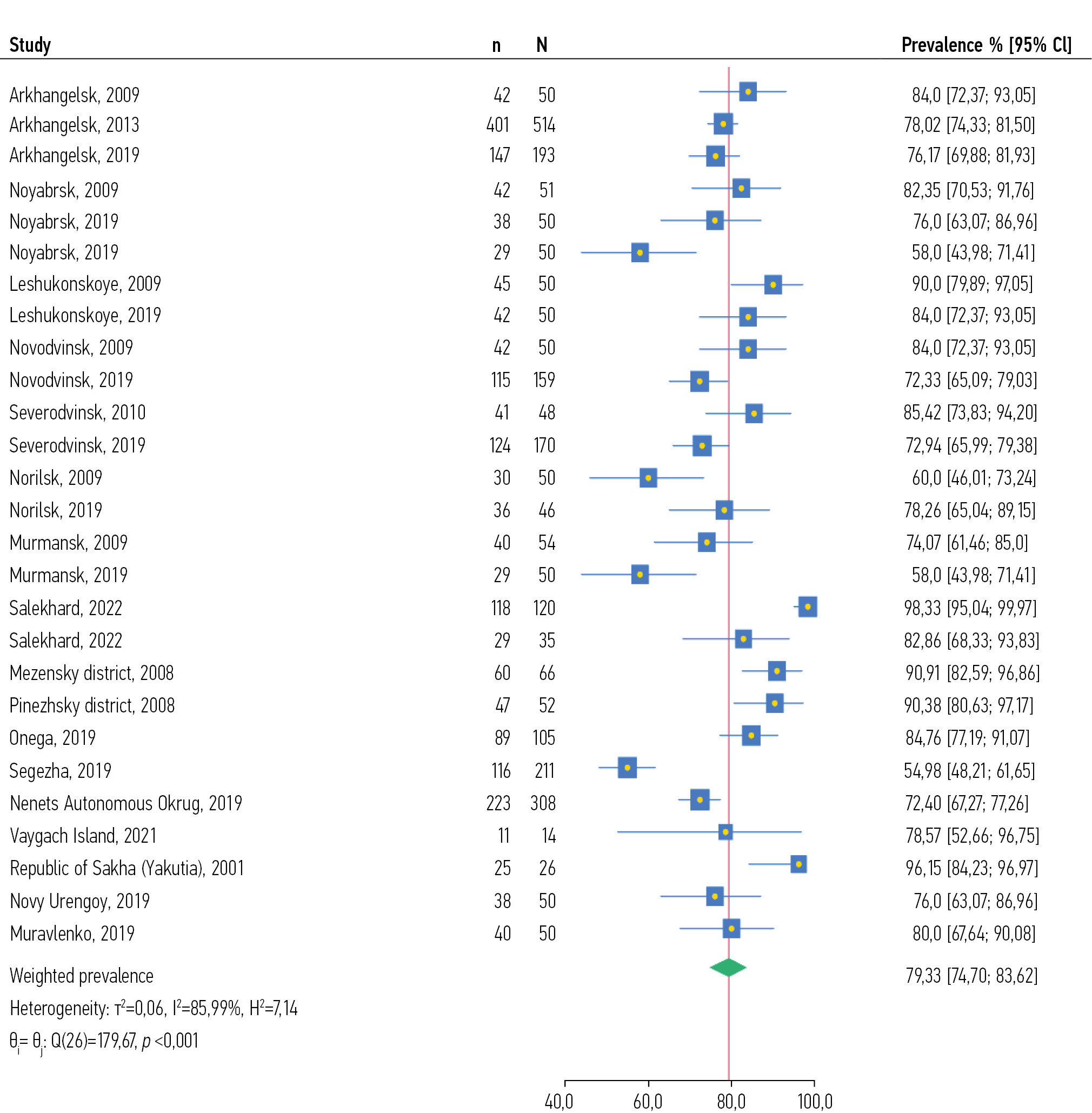 Fig. 2. Meta-analysis of dental caries prevalence studies in 12-year-olds in the Russian Arctic in 1998–2023: n, number of examined children with dental caries; N, number of examined children; CI, confidence interval.