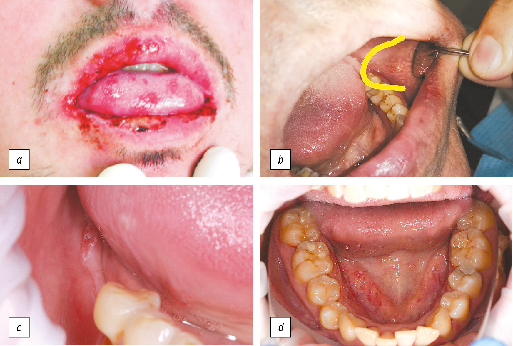 Fig. 1. Clinical picture of recurrent herpetic stomatitis: a — red border of the lips, b — buccal mucosa, c — gums and alveolar ridge, d — floor of the mouth.