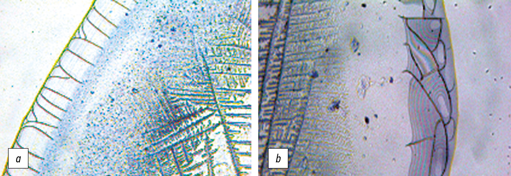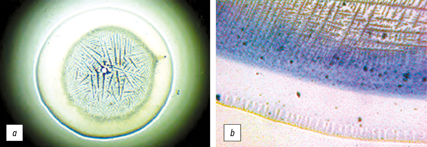 Fig. 2. Images of the protein zone of oral fluid facies during wedge-shaped dehydration in patients with recurrent herpetic stomatitis during an exacerbation: a — control group, b — patients in the acute stage.