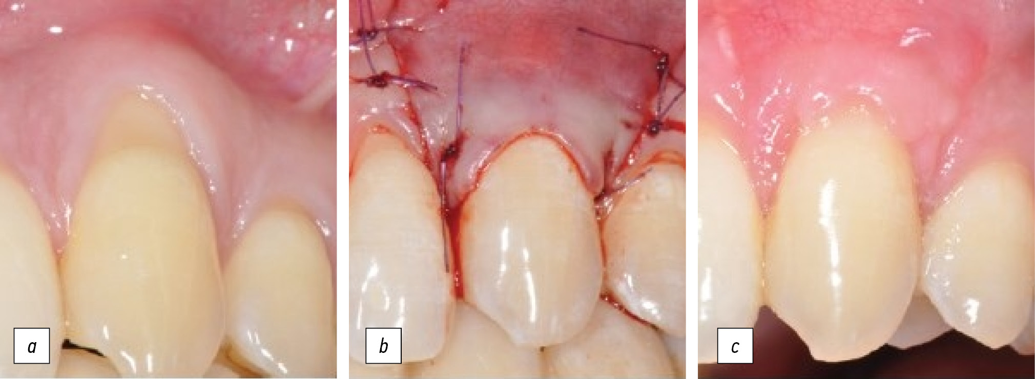 Fig. 1. Coronally advanced flap technique. a, Miller Class I gingival recession; b, suturing stage with coronally advanced flap; c, healing at 4 weeks postoperatively.