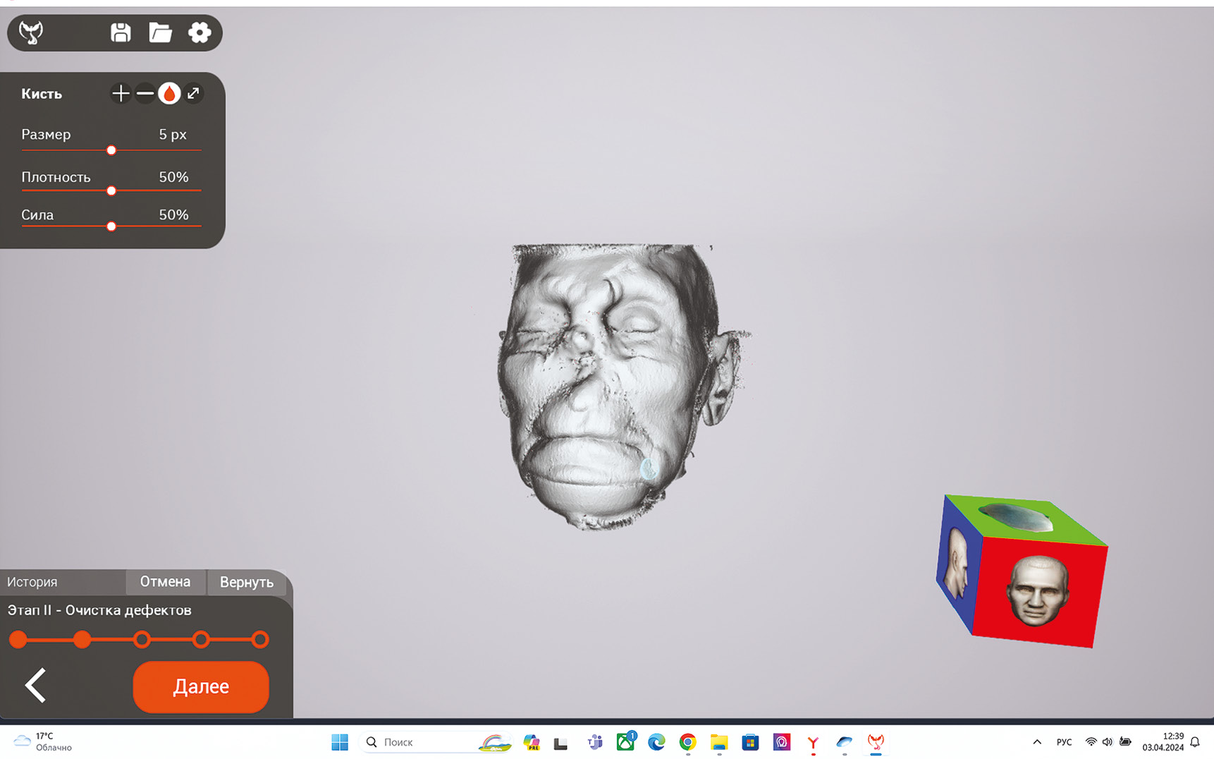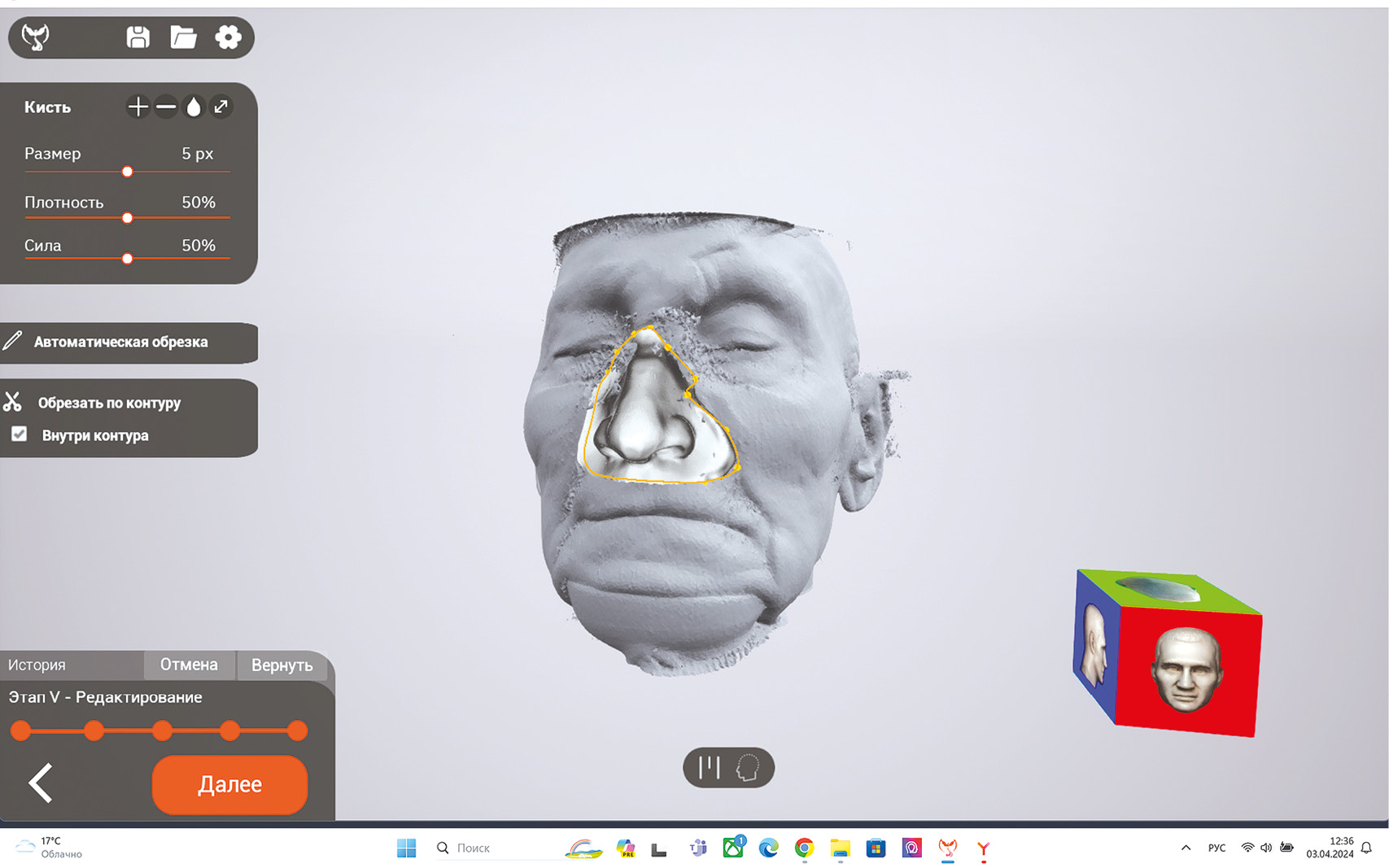 Then, specialists manually make corrections to the design using built-in editing tools. Further, a 3D virtual model of a part of the face is exported in.stl or.obj format, with subsequent production using additive or subtractive technologies (Fig. 4).
