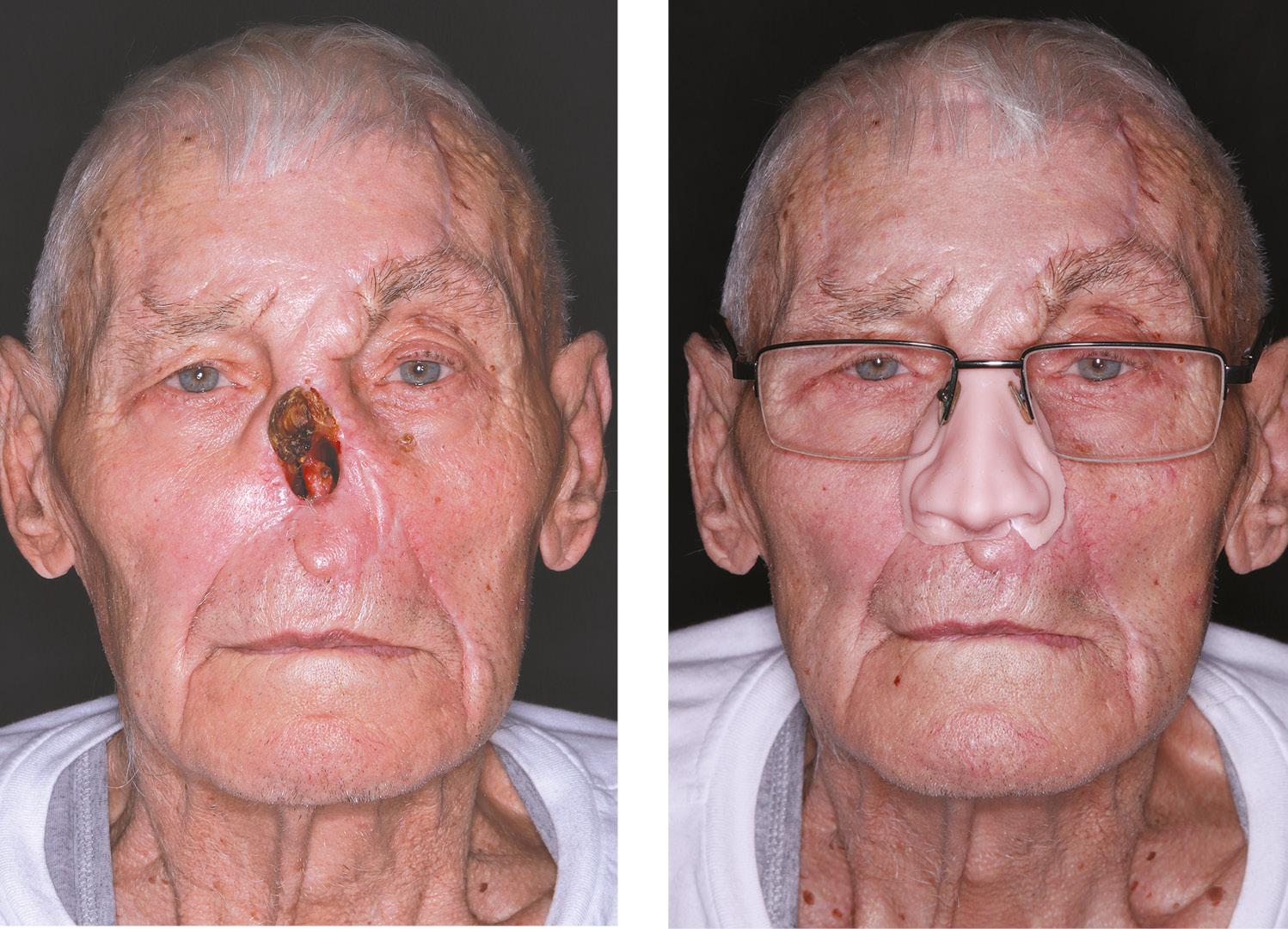 Fig. 4. Appearance of a patient with a nose defect of oncological origin before and after prosthetics with a temporary epithesis made by 3D printing using the proposed technology.