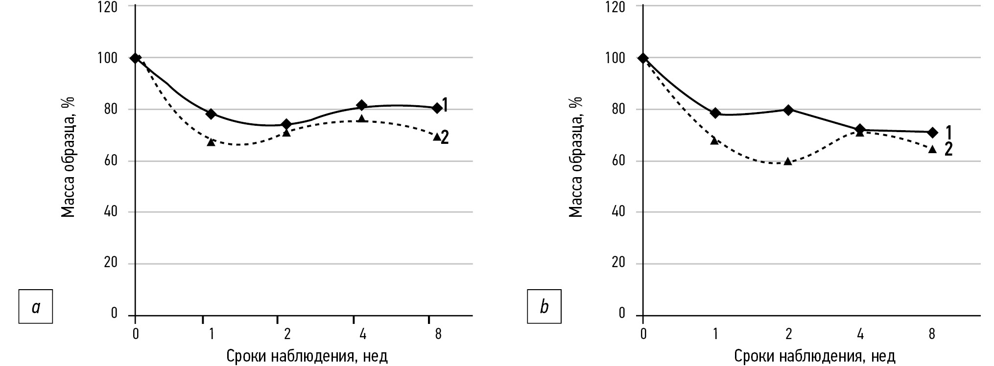 Рис. 1. Динамика деградации in vitro образцов бесколлагеновой (1) и коллагеновой мембраны (2) в фосфатно-солевом буфере при рН 6,50 (a) и рН 7,37 (b).