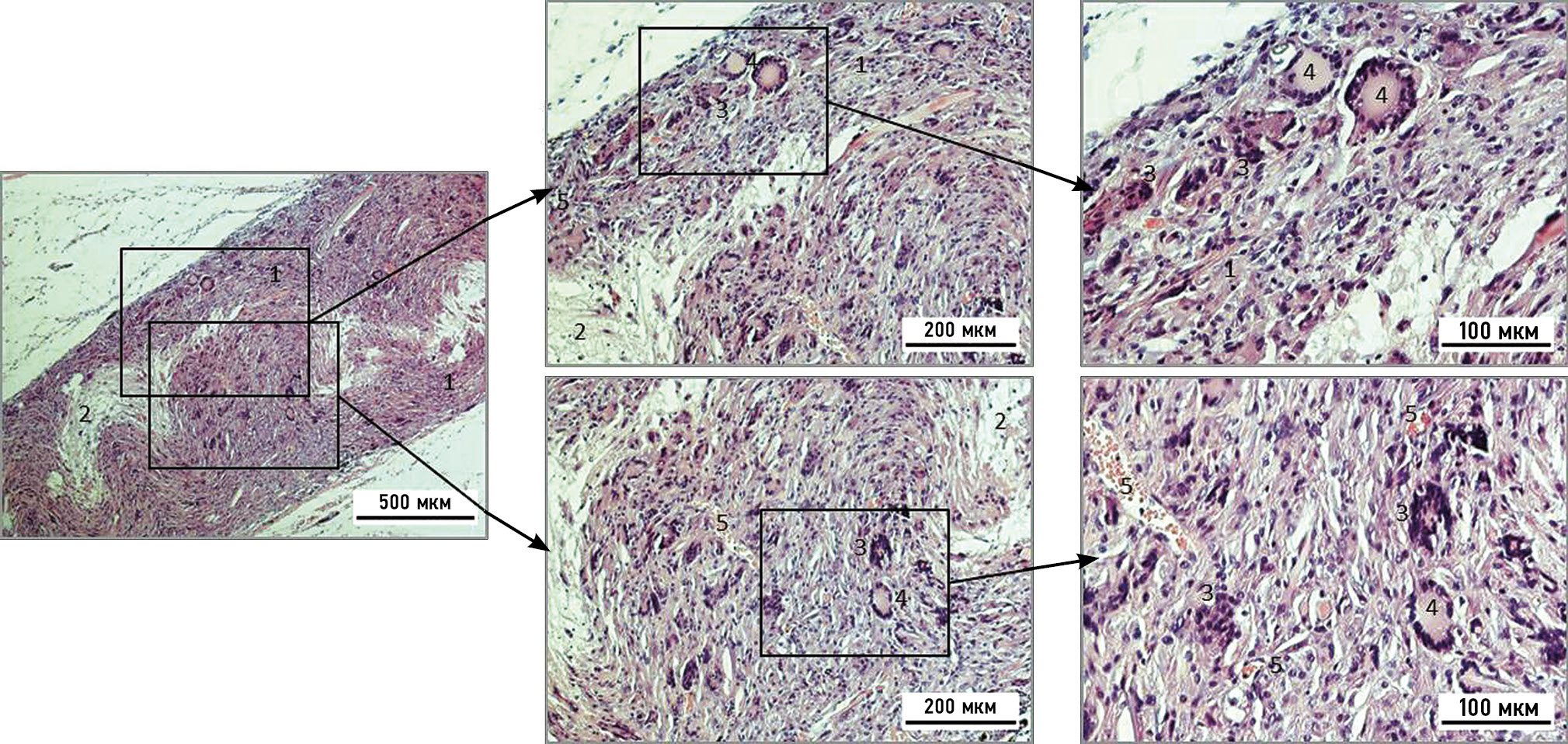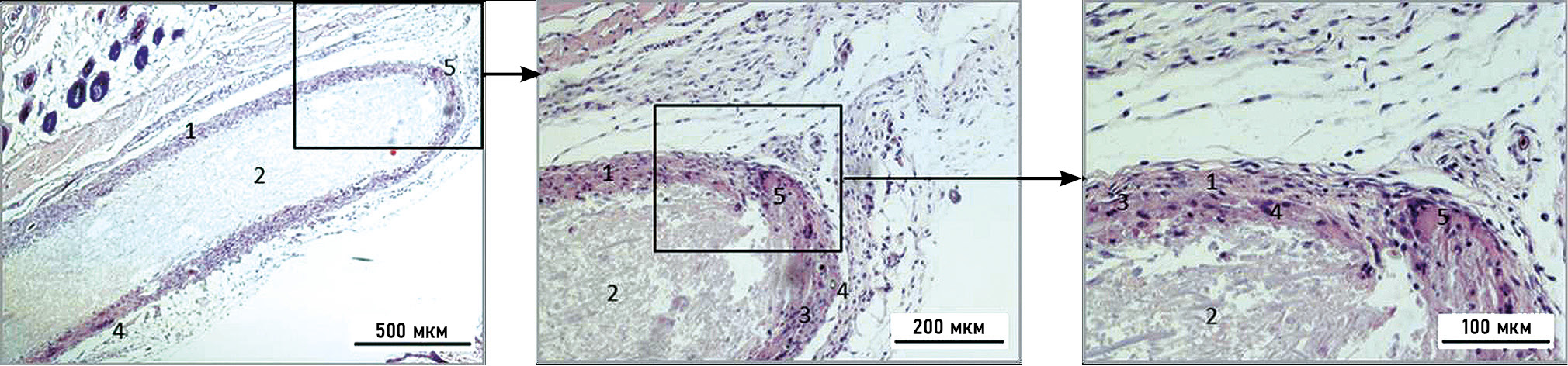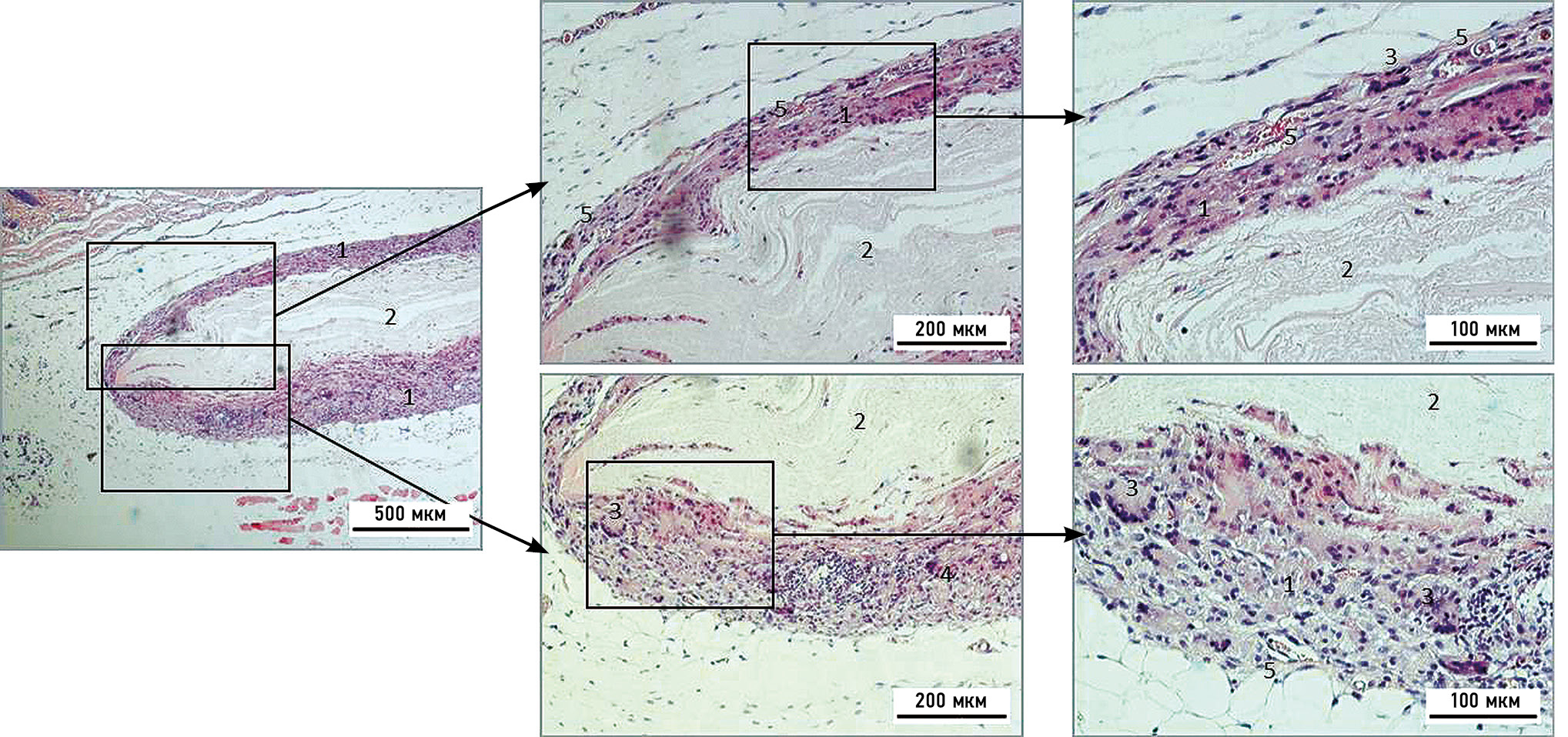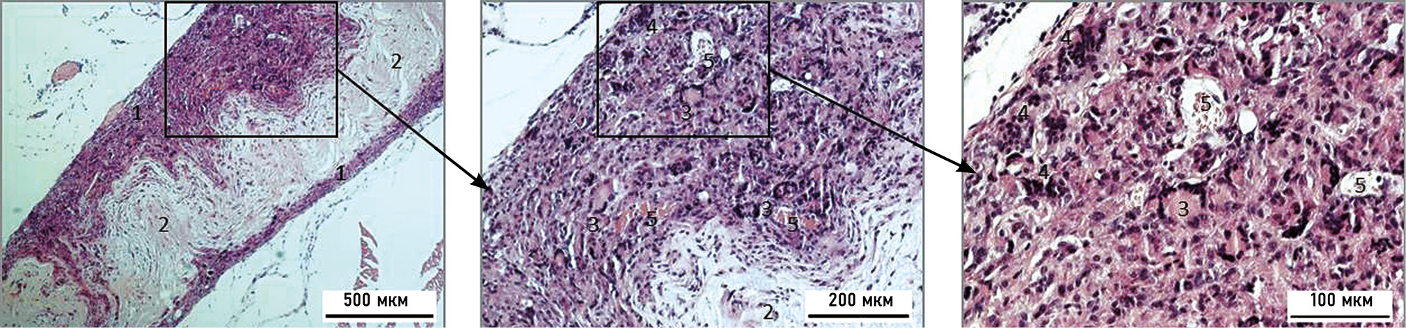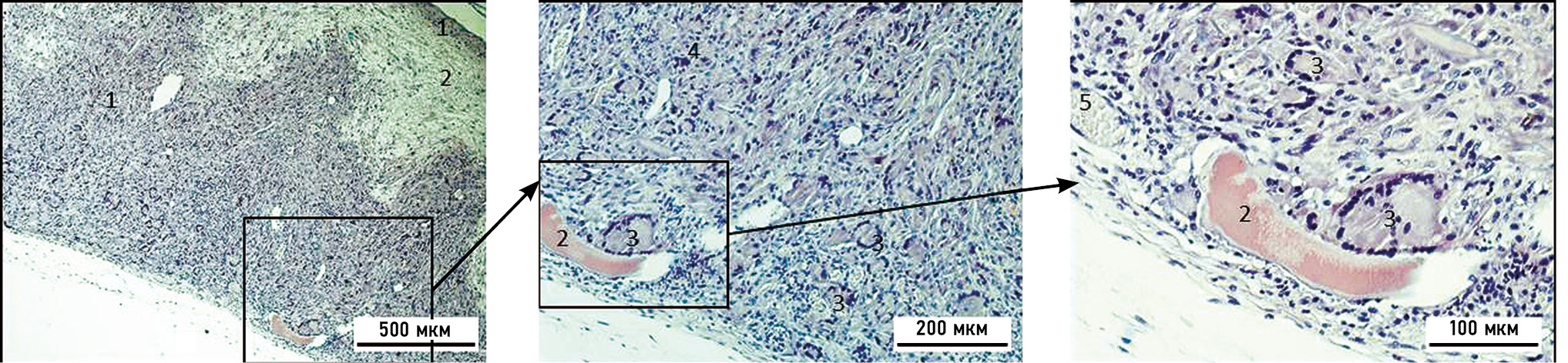 Рис. 7. Микрофотография коллагеновой мембраны через 4 нед после её подкожной имплантации, окраска — азур-эозин: 1 — гранулёма инородного тела; 2 — остатки коллагеновой мембраны; 3 — гигантские клетки Пирогова–Лангханса; 4 — гигантские клетки инородных тел; 5 — кровеносные сосуды.