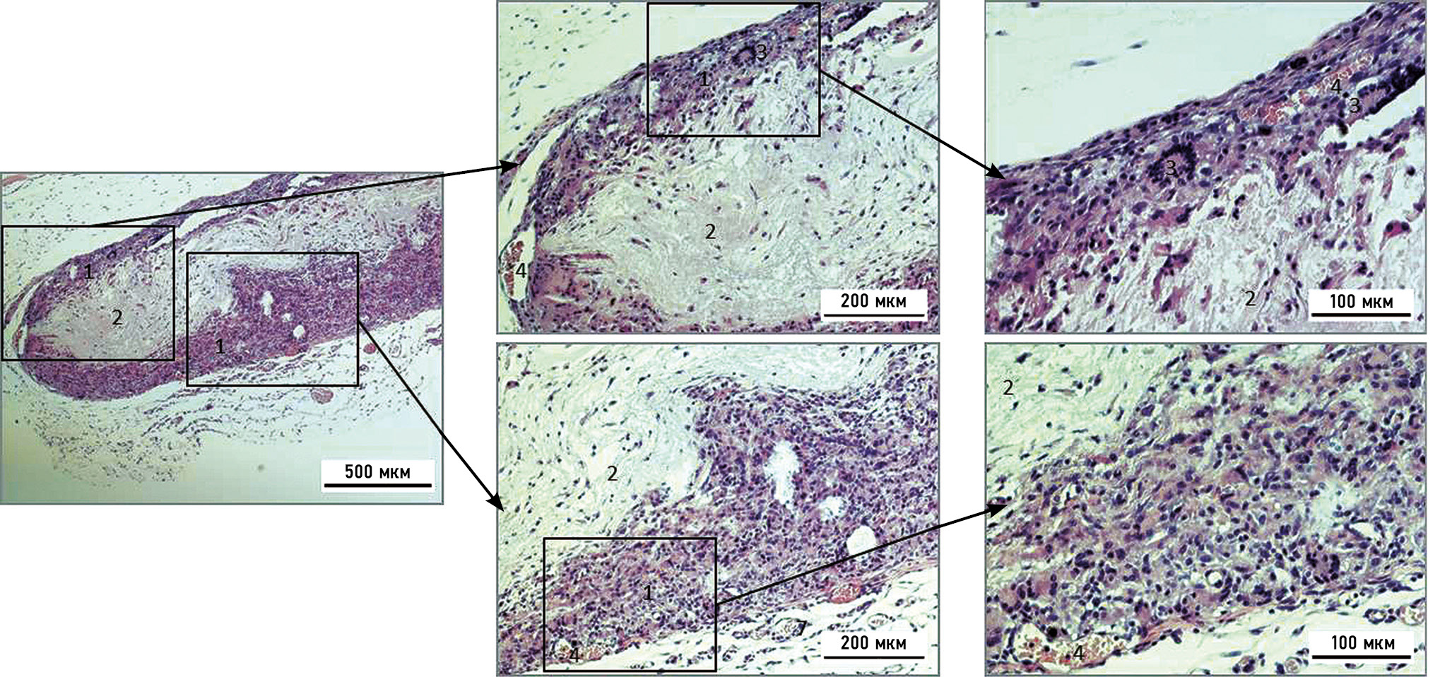 Рис. 6. Микрофотография коллагеновой мембраны через 2 нед после её подкожной имплантации, окраска — азур-эозин: 1 — гранулёма инородного тела; 2 — коллагеновая мембрана; 3 — гигантские клетки Пирогова–Лангханса; 4 — кровеносные сосуды.