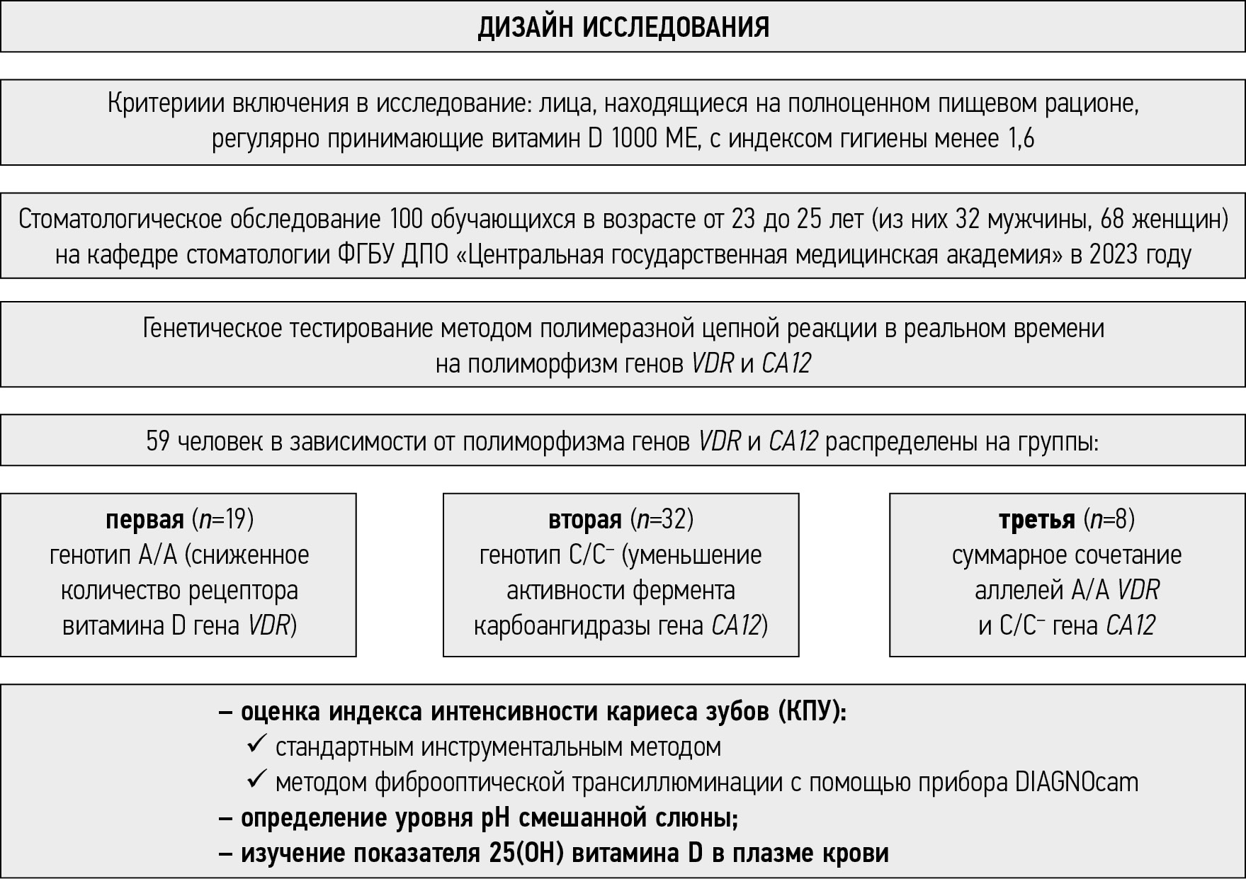 Результаты исследования показали, что низкая активность рецепторов гена VDR, сниженная концентрация метаболита холекальциферола связаны с высоким индексом интенсивности кариеса зубов.