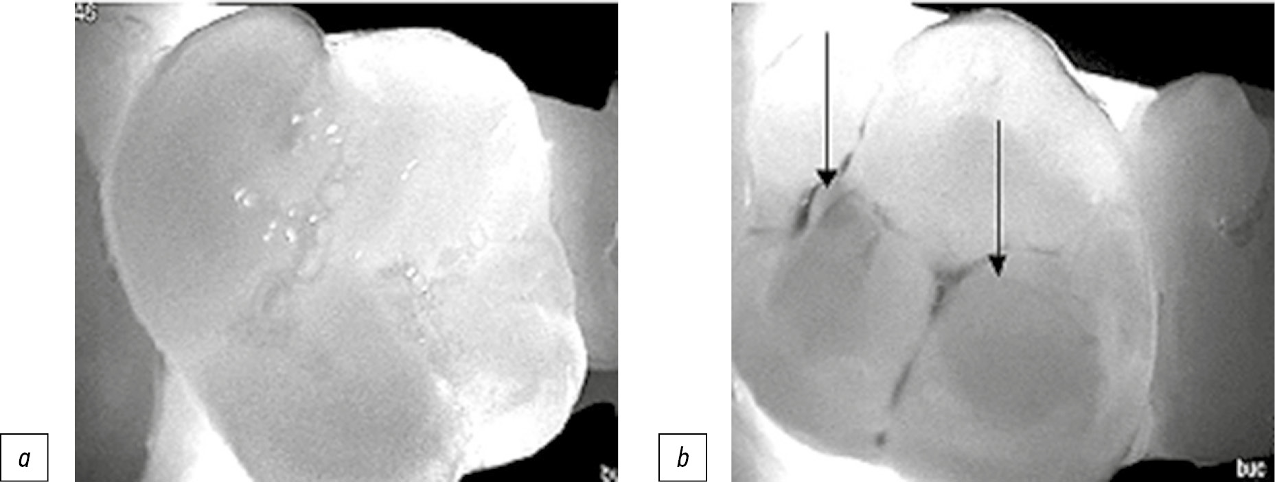 Рис. 2. Очаги кариозного поражения, определяемые трансиллюминационным методом в режиме реального времени: а — зуб 2.6 без признаков кариозного поражения; b — зуб 1.6 с определяемыми признаками кариозного поражения в виде очагов затемнения на жевательной поверхности (показано стрелками).