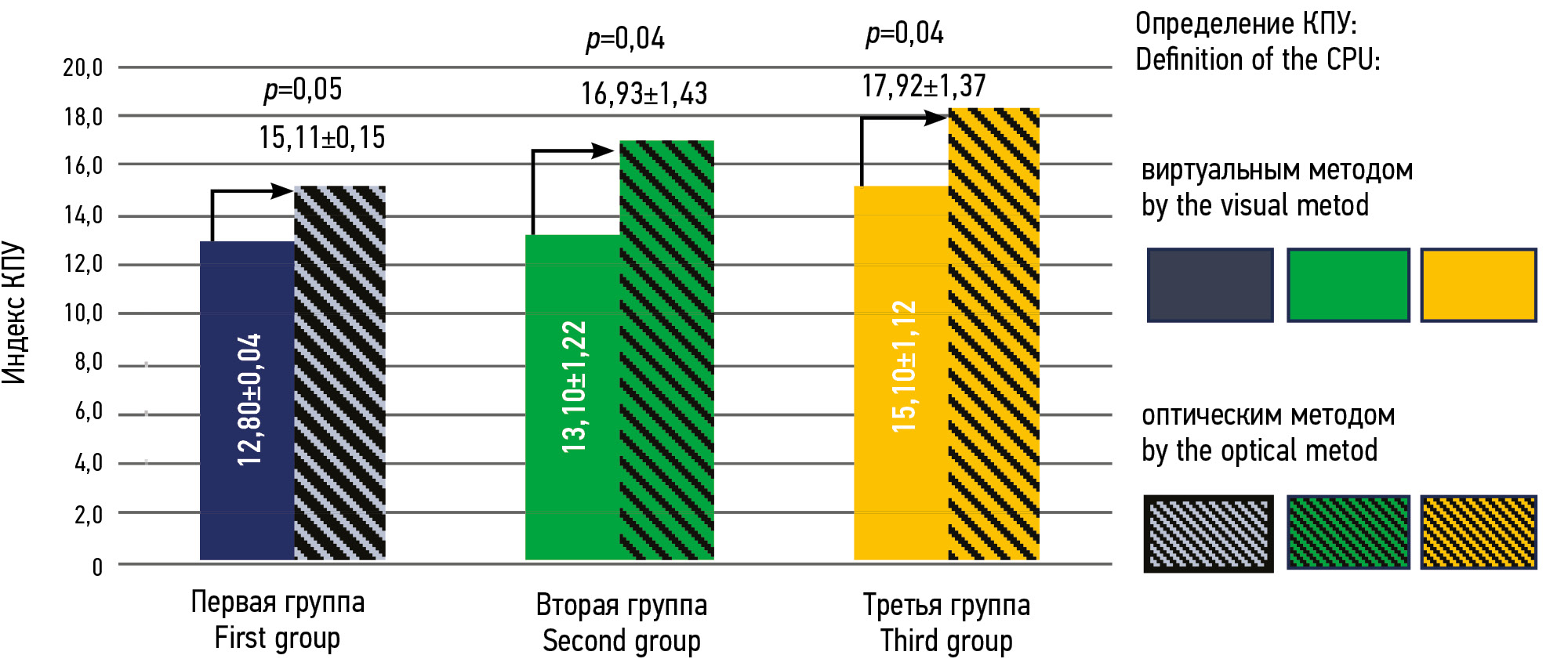 Рис. 3. Показатели интенсивности кариеса (индекс КПУ) в группах наблюдения при измерении визуальным методом и трансиллюминационным (оптическим) методом.