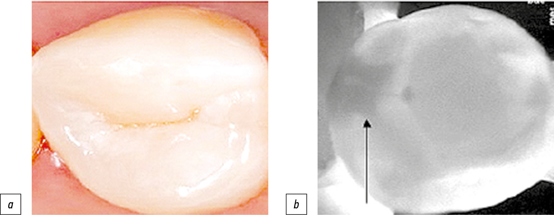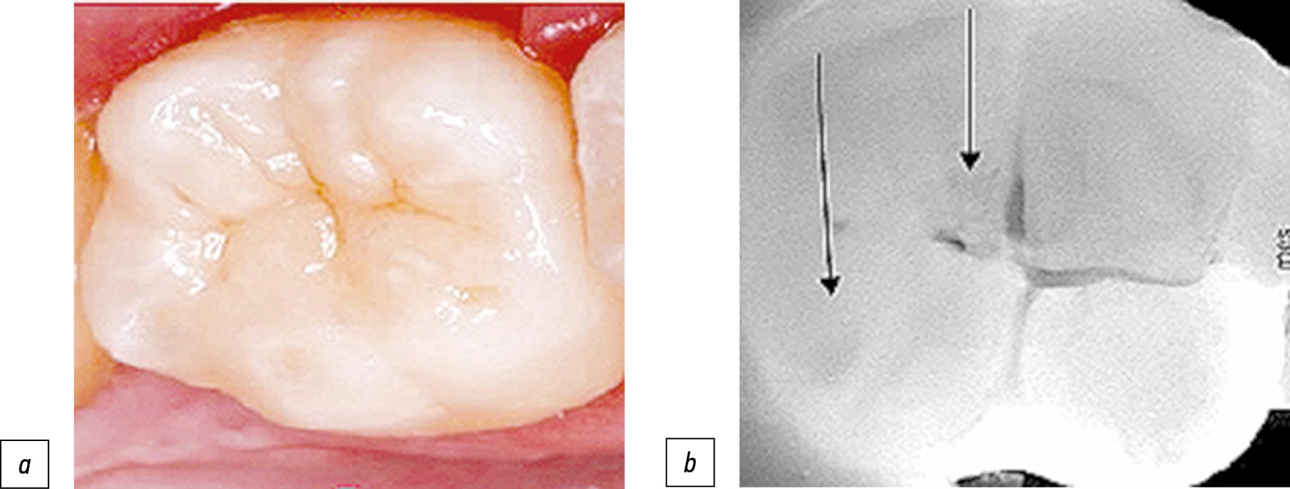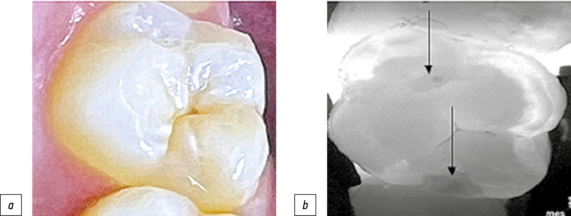 Рис. 4. Пациент 3., 24 года, осмотр зуба 1.6: a — инструментальный способ, определяется кариозное поражение эмали в области фиссур; b — трансиллюминационный метод, кариозная полость визуализируется в виде очага обширного затемнения на жевательной и дистальной контактной поверхности (показано стрелками).