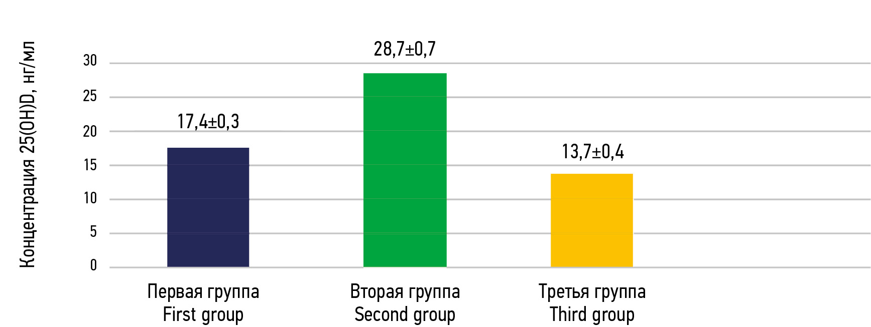 - У всех обследованных методом иммуноферментного анализа определяли в сыворотке крови основной циркулирующий метаболит витамина D — показатель 25(ОН)D (нг/мл) («Гемотест», Россия) по референсной шкале [9]: при показателях <20 нг/мл (50 нмоль/л) — дефицит витамина D, от 20 до 30 нг/мл (от 50 до 75 нмоль/л) — недостаточность, более 30 нг/мл (75 нмоль/л) — норма.