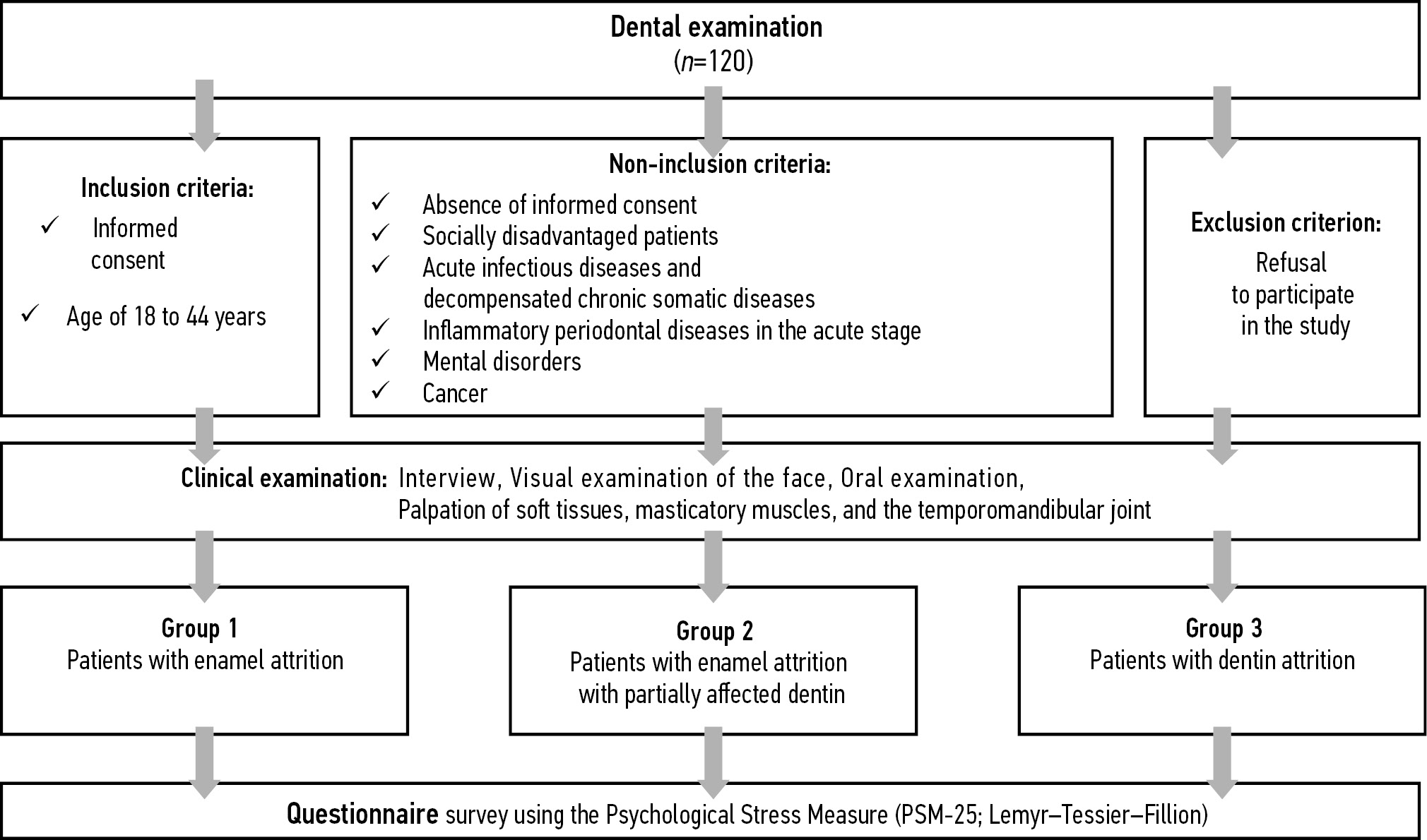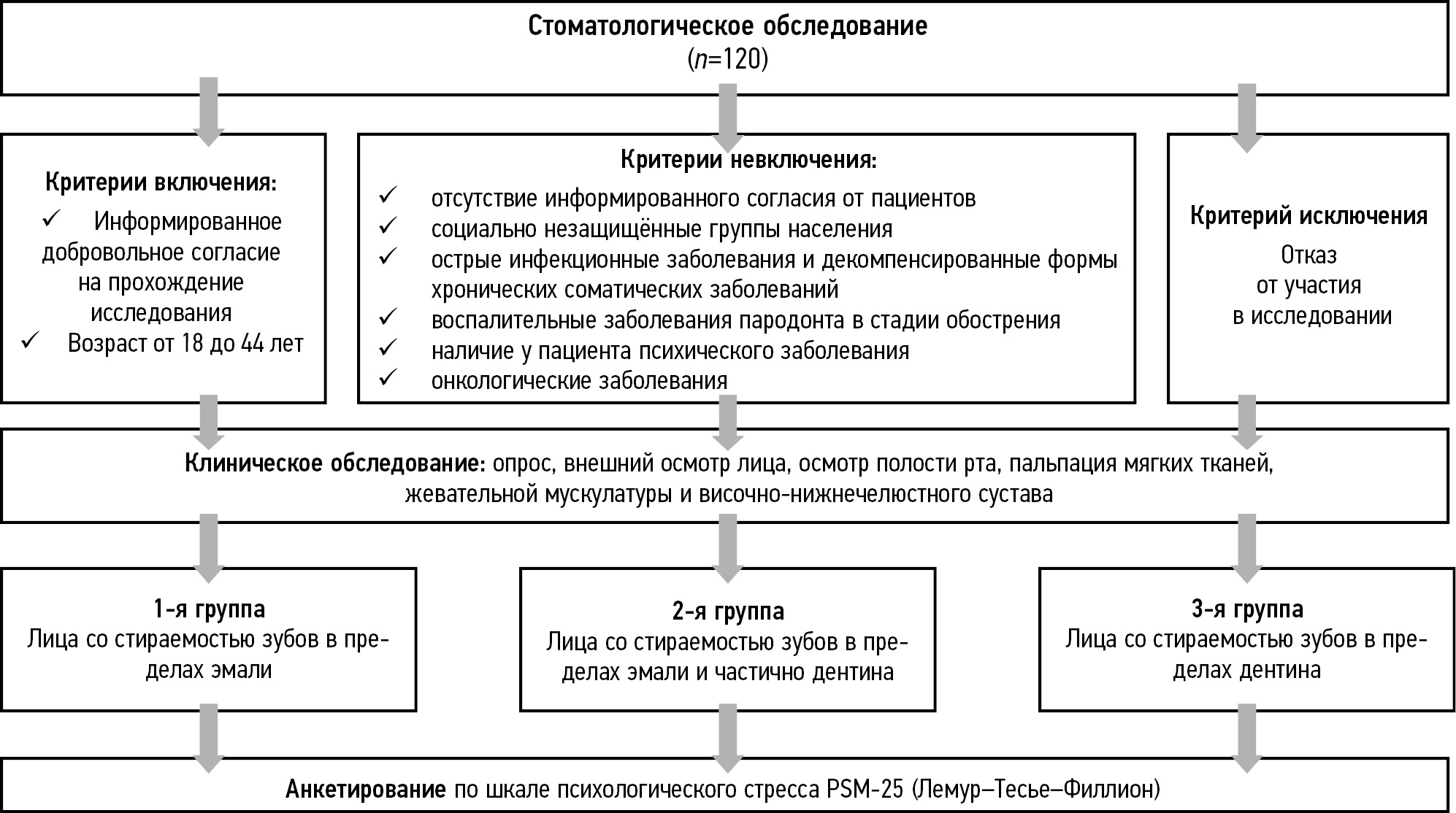 Materials and methods: The severity of psychoemotional stress was assessed in 120 patients with abnormal occlusion. A dental examination using primary and secondary methods was performed in all patients. Following a clinical examination, the patients were divided into three groups based on the severity of dental attrition (according to Bushan, 1979). The Russian version (according to Vodopianova) of the Psychological Stress Measure (PSM-25; Lemyr–Tessier–Fillion) was used to assess the severity of psychoemotional stress. The questionnaire included 25 questions with an 8-point score for the interpretation of answers, with 1 point representing the absence of psychoemotional stress symptoms and 8 points representing constant daily emotional stress.
