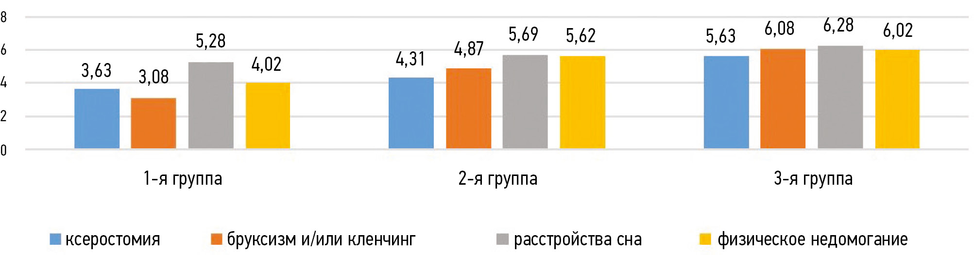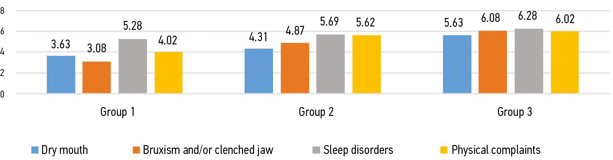 Bruxism and/or clenched jaw | 3.080±0.099 (n=19) | 4.870±0.185 (n=44) | 6.080±0.122 (n=28) |