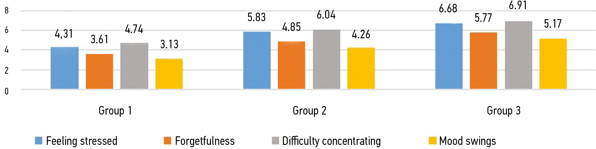 Mood swings | 3.130±0.063 (n=28) | 4.260±0.085 (n=34) | 5.170±0.186 (n=20) |