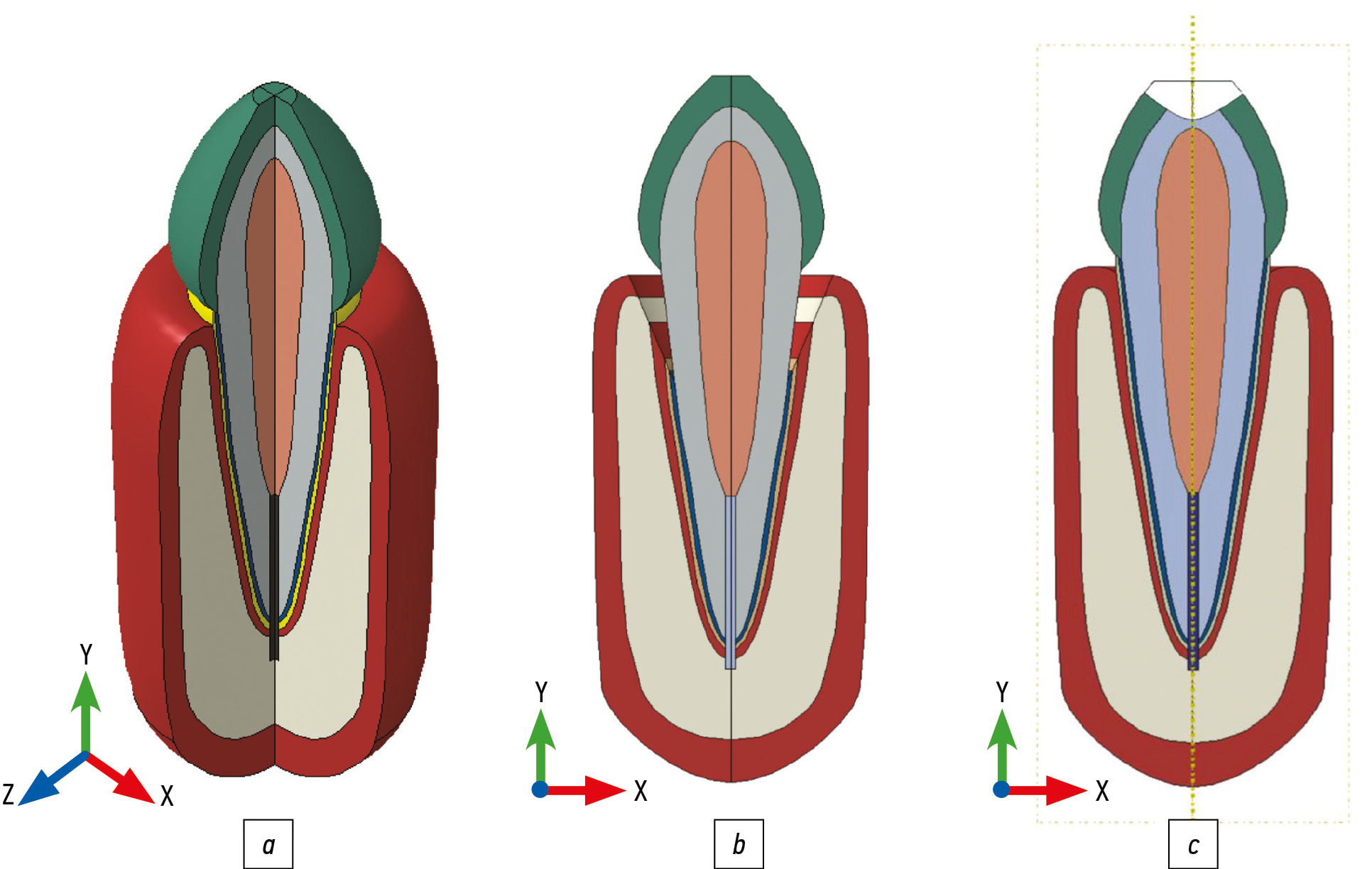 Fig. 1. Options of a three-dimensional mathematical model of a single-root mandibular tooth (premolar) under abnormal biomechanical conditions: a, intact tooth; b, bone resorption by 30%; c, tooth cavity.