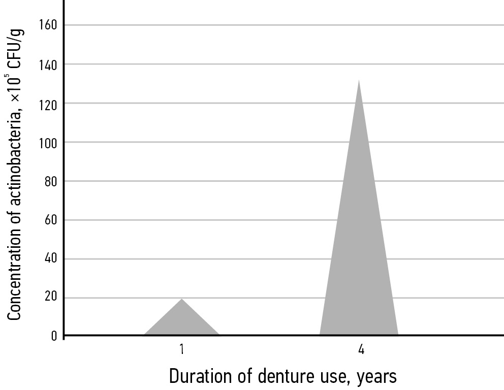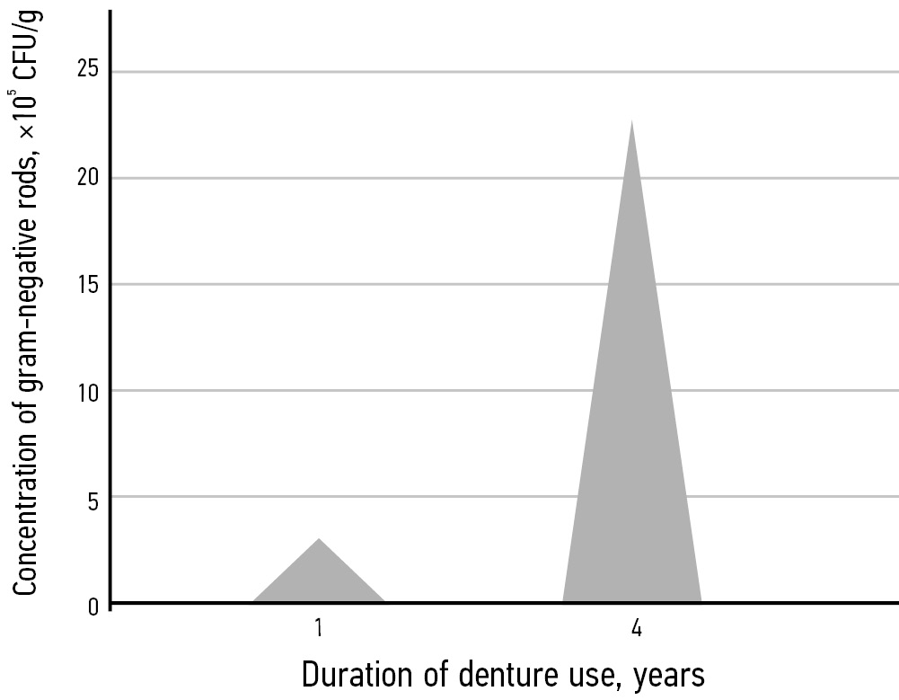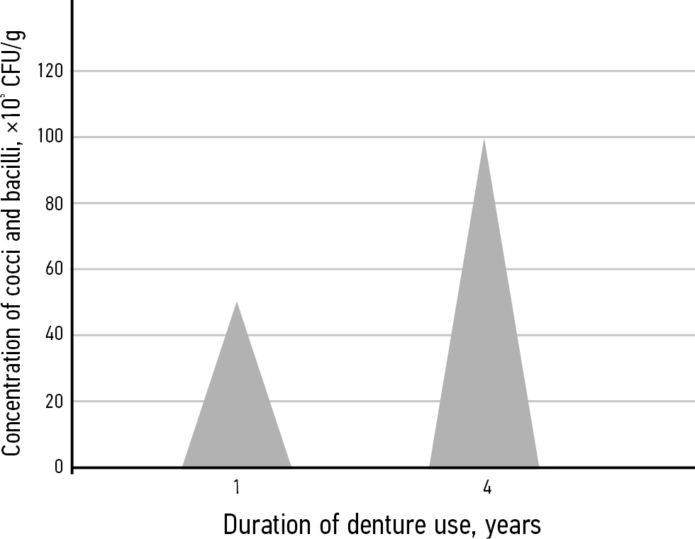 MATERIALS AND METHODS: The study included 40 fully edentulous patients (К08.1) who used acrylic complete dentures for no more than 5 years. There were two groups (n=20 each) based on the duration of use of complete dentures: 1 year in Group 1 and 4 years in Group 2. The microbiota composition was examined by mass spectrometry. The Statistiсa 13 package was used for statistical processing of the study findings. For multiple comparisons, the parametric t-test with Bonferroni correction was used to assess intergroup differences, with p=0.05 as the critical significance level.
