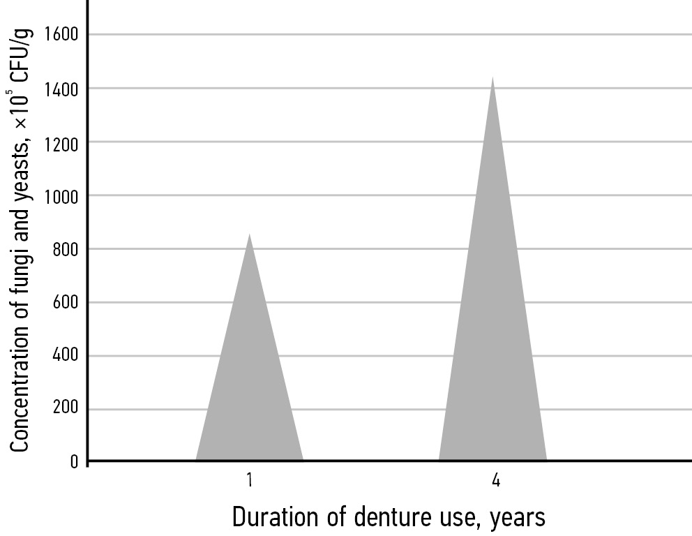 The study included 40 fully edentulous patients (К08.1) using acrylic complete removable dentures for no longer than 5 years. They were divided into 2 groups: Group 1 (n=20) used dentures for 1 year; Group 2 (n=20) used dentures for 4 years.
