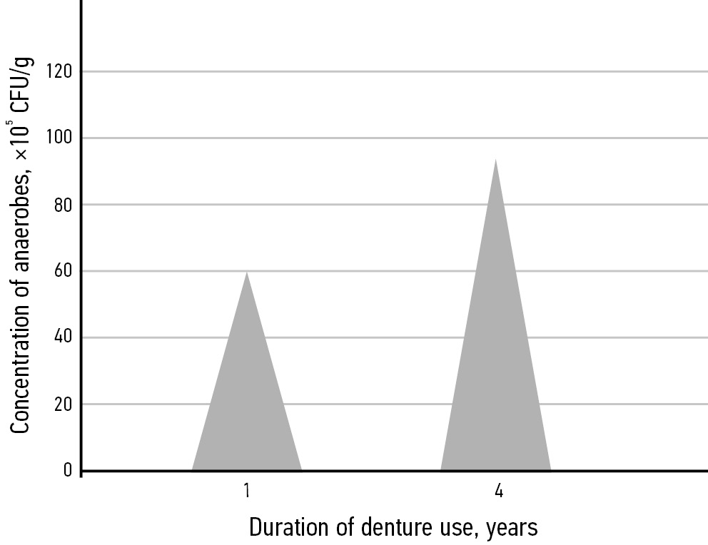 RESULTS: Microbial contamination increased in all examined patients after using complete dentures for 1 to 4 years. Cocci and bacilli counts increased from 56±5 (105 cells/g) (р=0.03) to 107±8 (105 cells/g) (р=0.04). Anaerobe counts increased from 68±6 (105 cells/g) (р=0.0002) to 102±9 (105 cells/g) (р=0.0002). Actinobacteria counts increased from 30±3 (105 cells/g) to 143±12 (105 cells/g) (р=0.003). Gram-negative rod counts increased from 4±1 (105 cells/g) (р=0.0005) to 24±2 (105 cells/g) (р=0.0006). Yeast and mold counts increased from 977±90 (105 cells/g) (р=0.0003) to 1,587±136 (105 cells/g) (р=0.003).