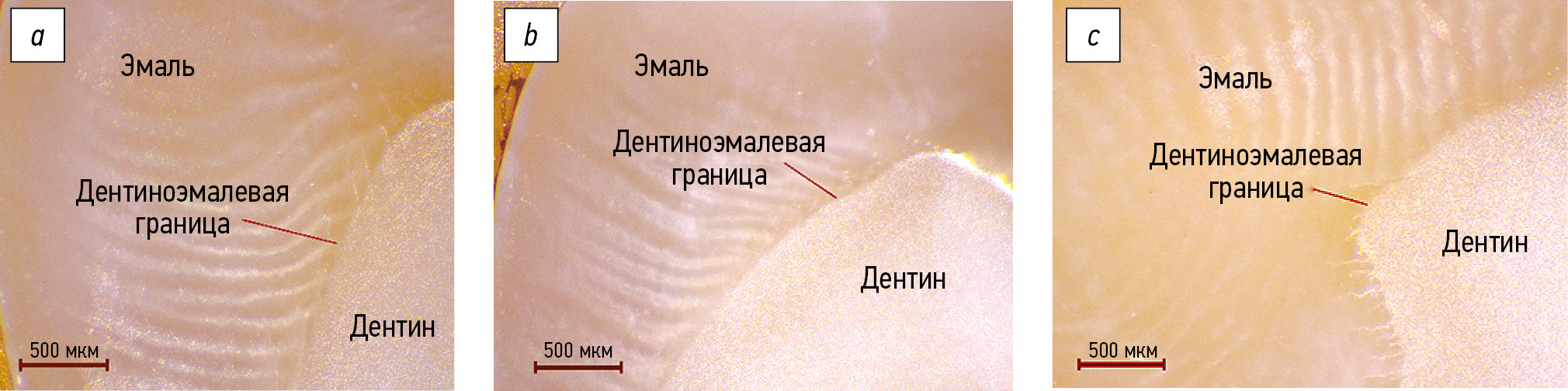 Эмаль, дентин и дентиноэмалевая граница были чётко видны на изображениях, которые указывают на здоровое состояние исследуемых образцов (см. рис. 1). Полосы Гунтера–Шрегера также были визуализированы на всех образцах.
