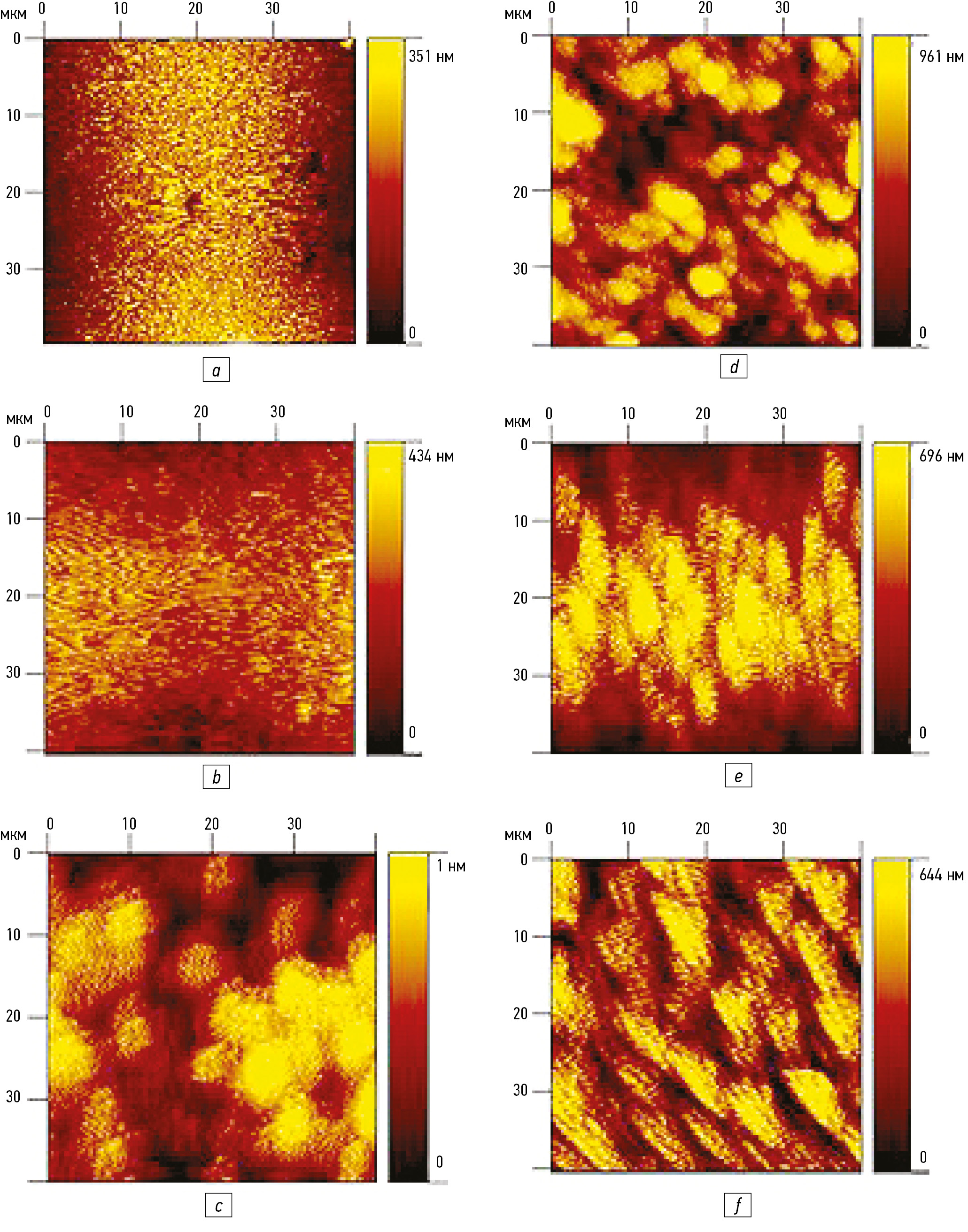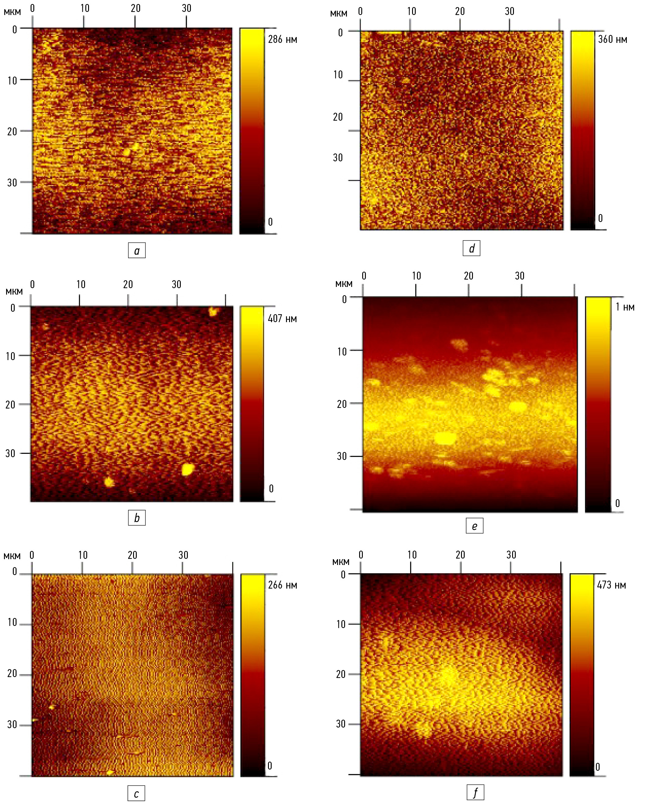 Fig. 2. AFM images of surfaces before etching (a — sample 1, b — sample 2, c — sample 3) and after 1 s of etching (d — sample 1, e — sample 2, f — sample 3). The images do not reflect the details of the microstructure. AFM — atomic force microscopy. © Eco-Vector, 2025.