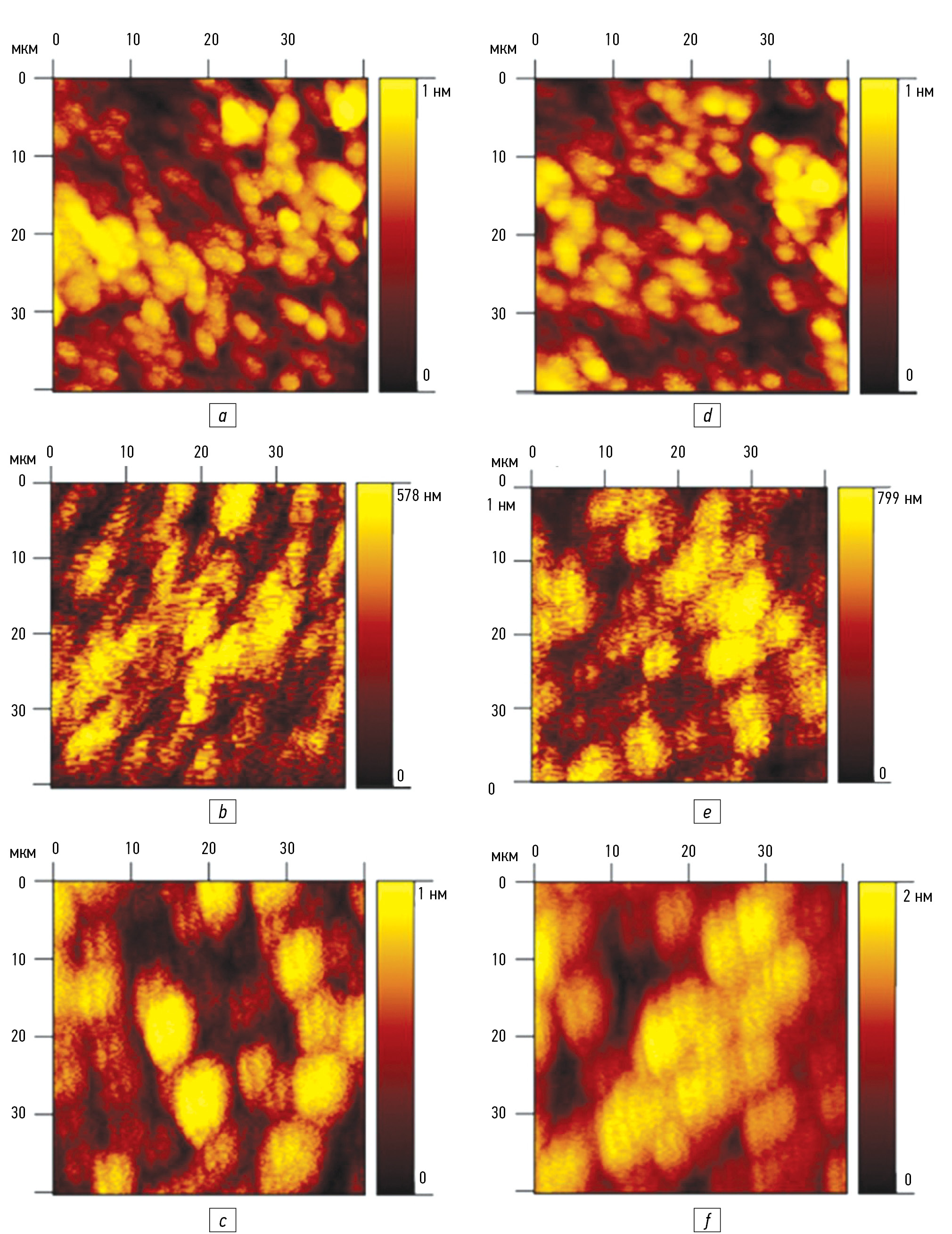 Рис. 4. АСМ-изображения поверхностей образцов после 45 с травления (a — образец 1, b — образец 2, c — образец 3) и после 60 с травления (d — образец 1, e — образец 2, f — образец 3). АСМ — атомно-силовая микроскопия. © Эко-Вектор, 2025.