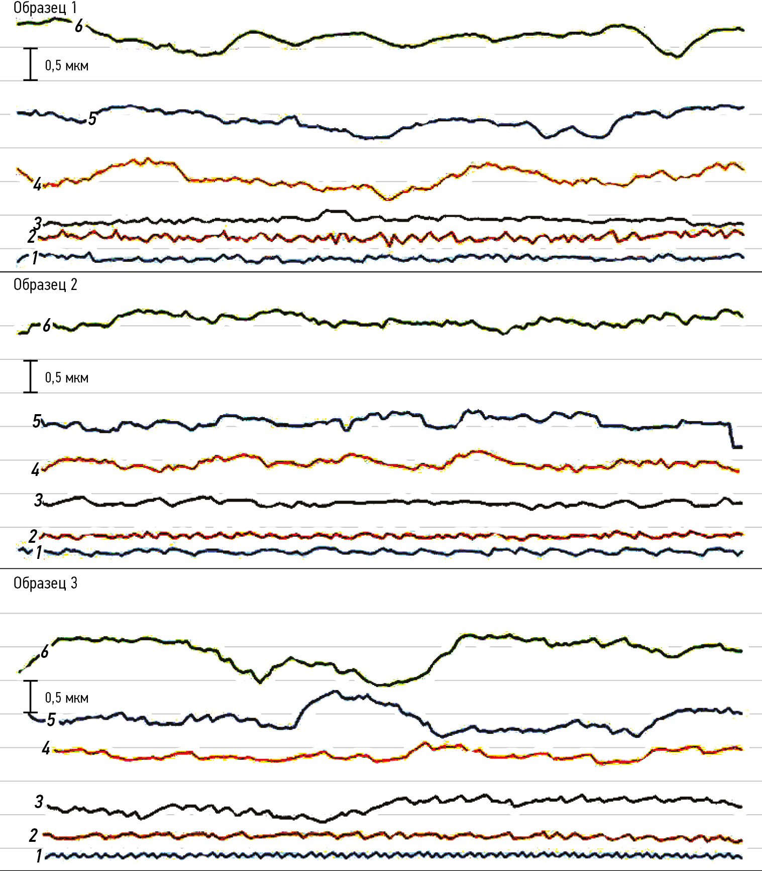 Среднее значение этих пяти профилей было принято как абсолютное в этом направлении (Raavg). Среднее значение шероховатости в трёх направлениях является абсолютным значением шероховатости данной поверхности (Raabsol). Результаты измерений для образцов 1–3 представлены в табл. 3–5 соответственно.