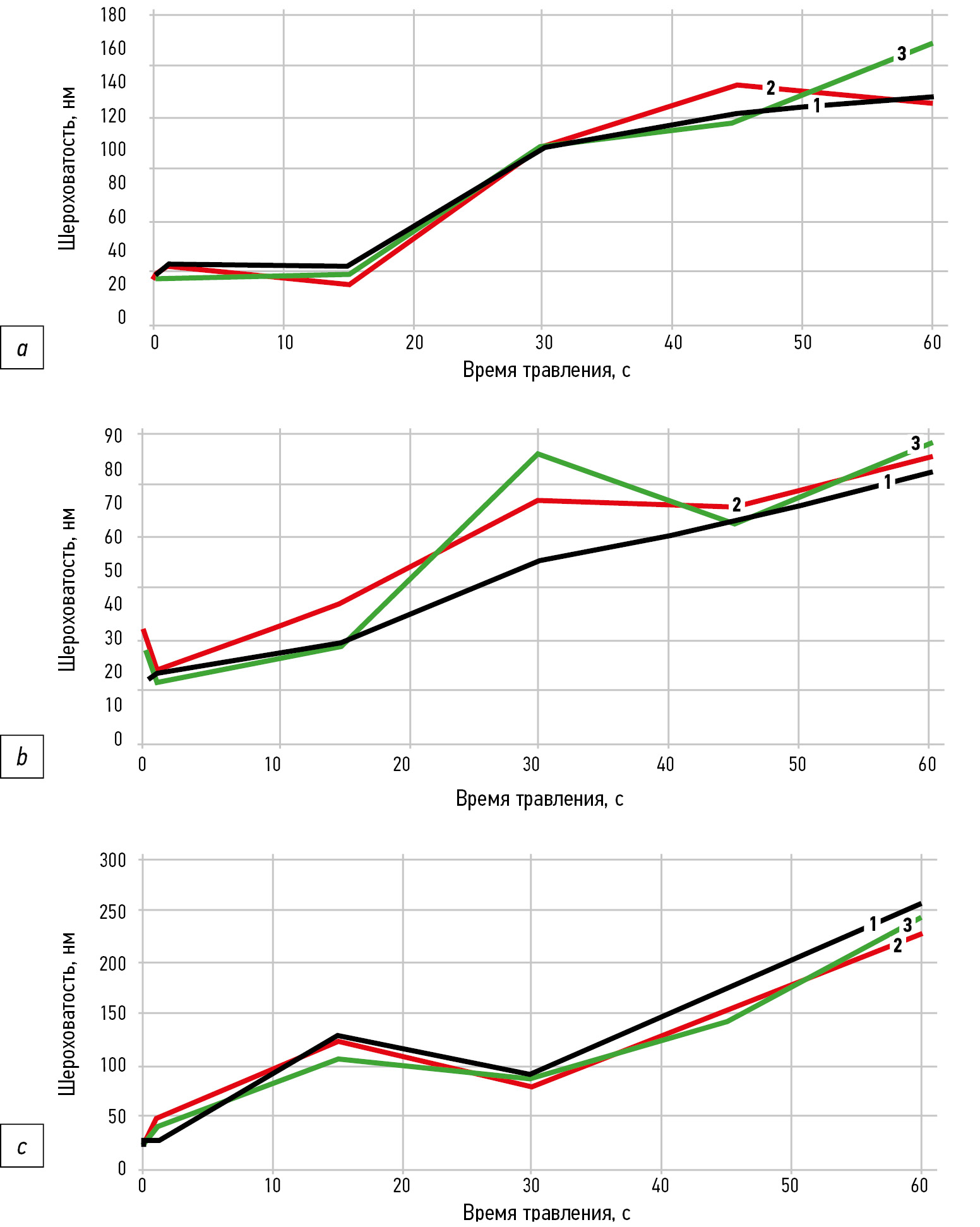 Рис. 8. Зависимость шероховатости поверхности Ra от времени травления в разных направлениях (1 — горизонтальное, 2 — вертикальное, 3 — диагональное) для: а — образца 1, b — образца 2, c — образца 3. © Эко-Вектор, 2025.