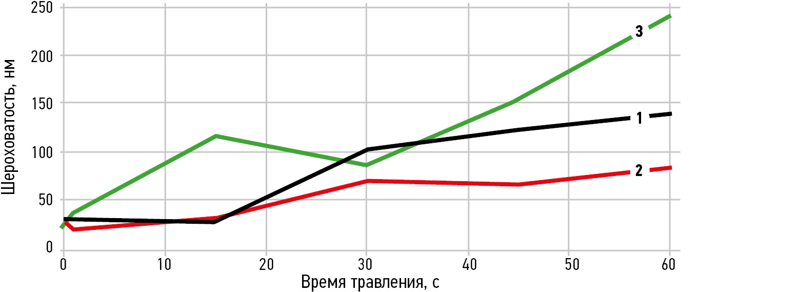 Шероховатость поверхности Ra измеряли на каждом этапе травления для каждого образца с использованием программного обеспечения Gwyddion (Чешский метрологический институт, Чешская Республика). Последнее измерение было определено по результатам АСМ-профиля поверхности, полученным на основании данных АСМ (см. рис. 2–5). Из-за возможной нерегулярности визуализированной структуры мы считали измерение шероховатости, основанное на единственном профиле шероховатости в одном направлении, недостаточно корректным. В настоящей работе шероховатость поверхности измерялась в трёх направлениях: горизонтальном, вертикальном и диагональном. В каждом из направлений было построено пять профилей.