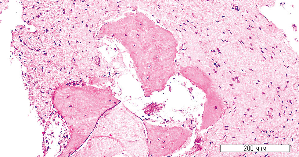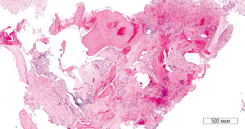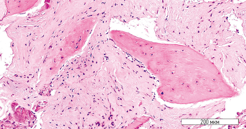 Fig. 6. Stromal component and newly formed immature bone trabecula (control group). Hematoxylin-eosin stain; original magnification ×400.