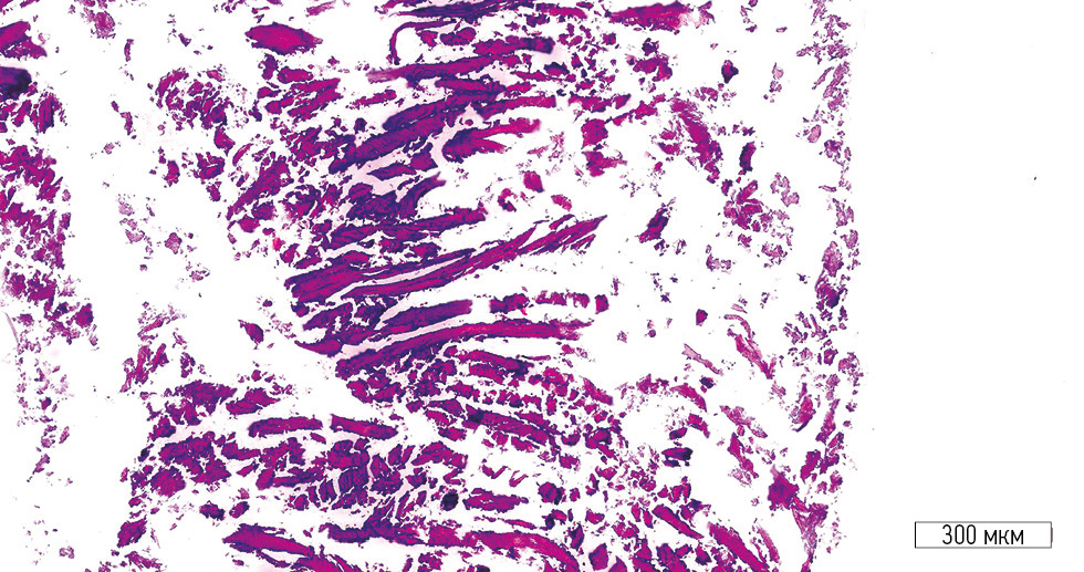 Fig. 5. Numerous bone fragments without stromal component or newly formed trabeculae (control group). Hematoxylin-eosin stain; original magnification ×200.