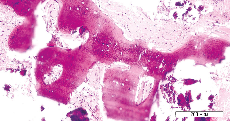 Fig. 4. Bone lamella with heterogeneous structure (treatment group). Hematoxylin-eosin stain; original magnification ×400.