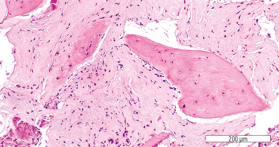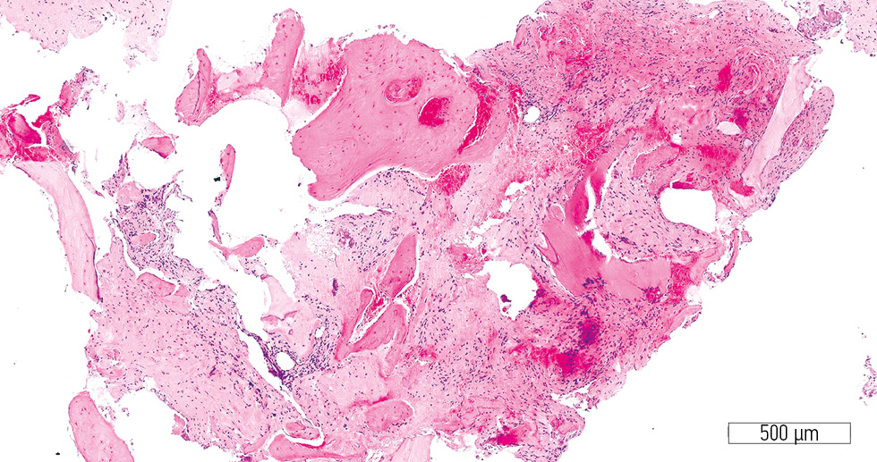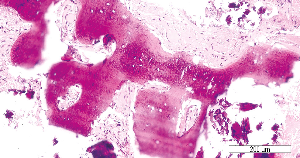 In the control group, numerous bone chip fragments were observed. Neither an obvious stromal component nor structured bone trabeculae were identified (Fig. 5). Isolated regions of active stromal component with pronounced vascularization were present. The bone trabeculae appeared immature, with osteoblasts and newly formed lacunae containing osteocytes (Fig. 6).