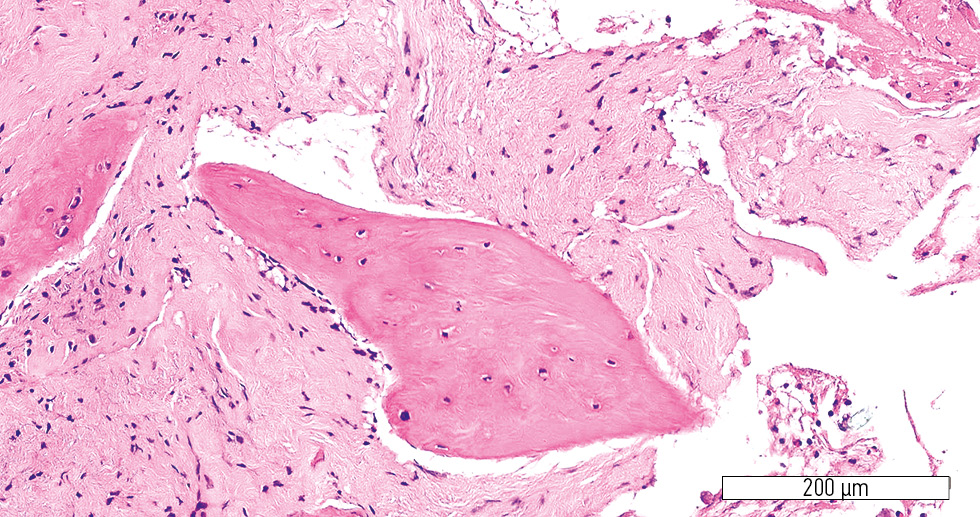 Closer examination of the bone lamellae revealed areas of non-uniform osteogenesis (Fig. 4). Maximum bone density was observed at the periphery of the trabeculae, whereas the central zones showed regions with immature osteons.