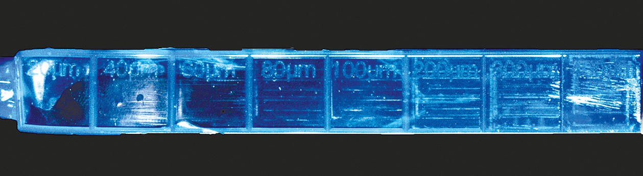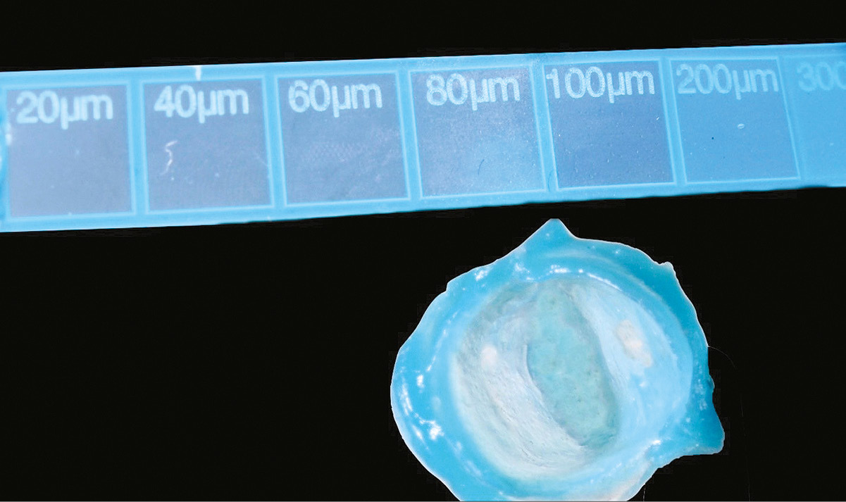 To determine the gap between the crown and the hard dental tissues, a low-viscosity silicone material, Speedex light body (Coltene, Switzerland), together with the calibrator, was used. The silicone was mixed strictly according to the manufacturer’s instructions. Immediately after mixing, part of the material was applied to the internal surface of the crown, and the remainder was placed into the calibrator, which was then closed with its upper plate. The crown was seated on the prepared tooth under firm finger pressure. After polymerization, the silicone strip was removed from the calibrator. The strip exhibited color changes depending on material thickness, with visible markings at 20, 40, 60, 80, 100, 200, 300, and 400 µm. This silicone strip served as a scale for measurement (see Fig. 2).