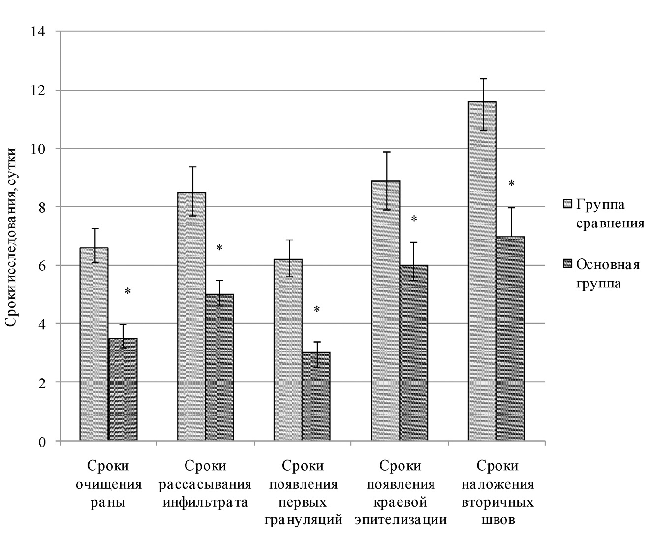 Статистический анализ данных, представленных в сутках изменений клинических характеристик раневого процесса, был выполнен с использованием программы Stat Plus для Windows в пакете Microsoft Excel 2010. Для оценки характера распределения проводили расчет критерия Шапиро–Уилка, сравнение показателей группы сравнения и основной группы проводили с использованием непараметрического критерия Манна–Уитни. Данные на столбиковой диаграмме представлены в виде медианы, а планки погрешностей отражают разброс показателей между 1-м и 3-м квартилями (Ме (Q1/Q3)).