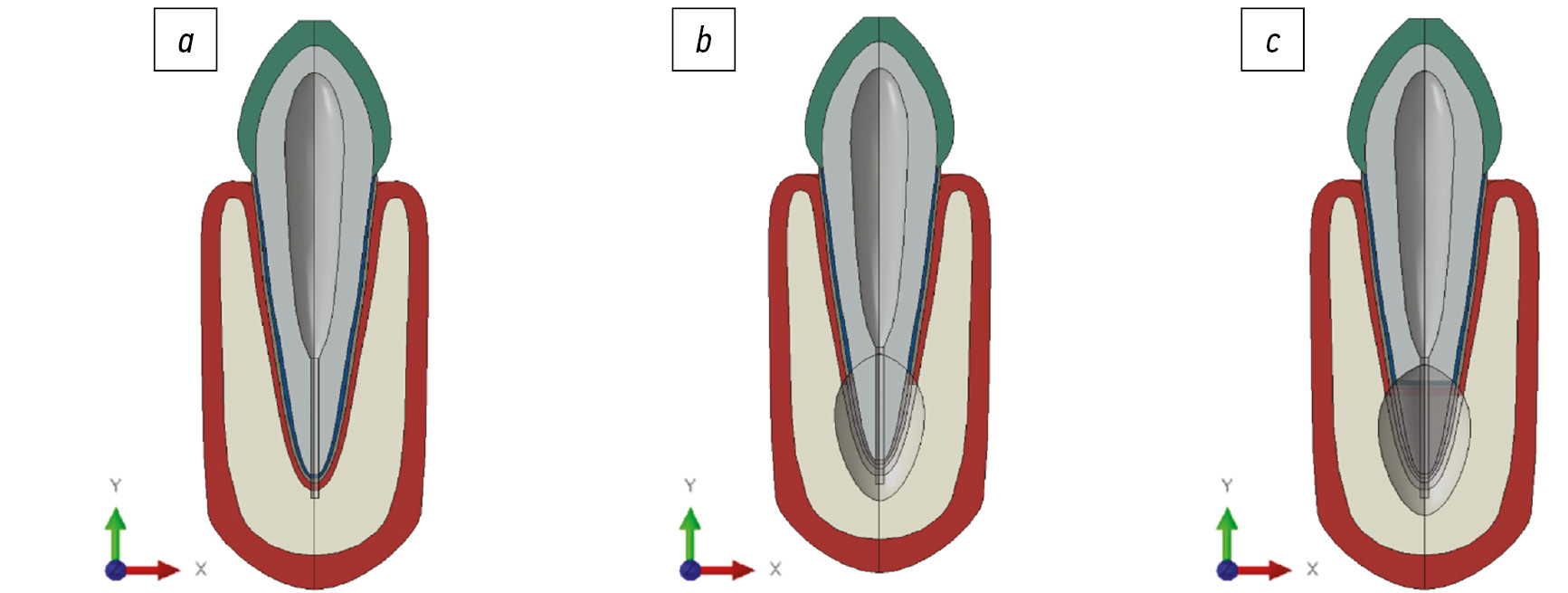 Fig. 1. Three-dimensional mathematical model of a single-rooted mandibular tooth (premolar) under unfavorable biomechanical conditions: a, intact tooth; b, tooth with periapical bone resorption; c, tooth after apicoectomy.