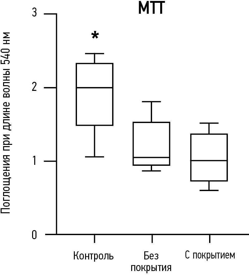 Рис. 1. Анализ жизнеспособности клеток ТНР-1 после инкубации с образцами имплантатов с покрытием и без него, а также в контрольной среде; * p < 0,05 против групп «без покрытия» и «с покрытием».