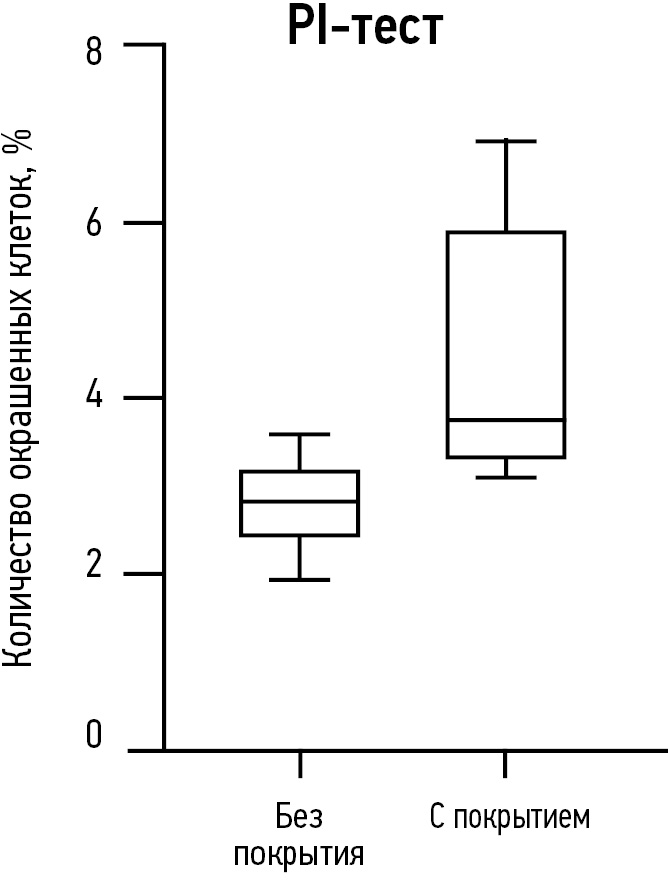 Рис. 2. Процент апоптотических пропидиум йодид положительных клеток после инкубации клеток с образцами имплантатов с покрытием и без него.
