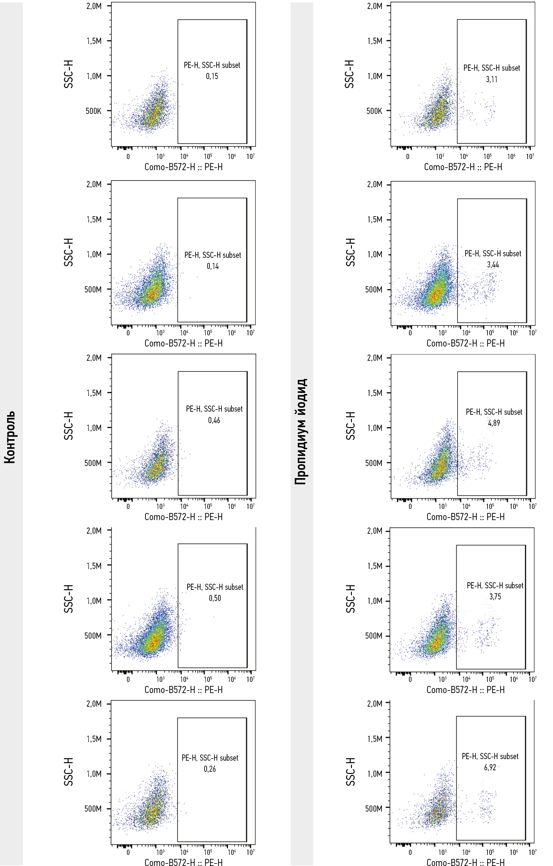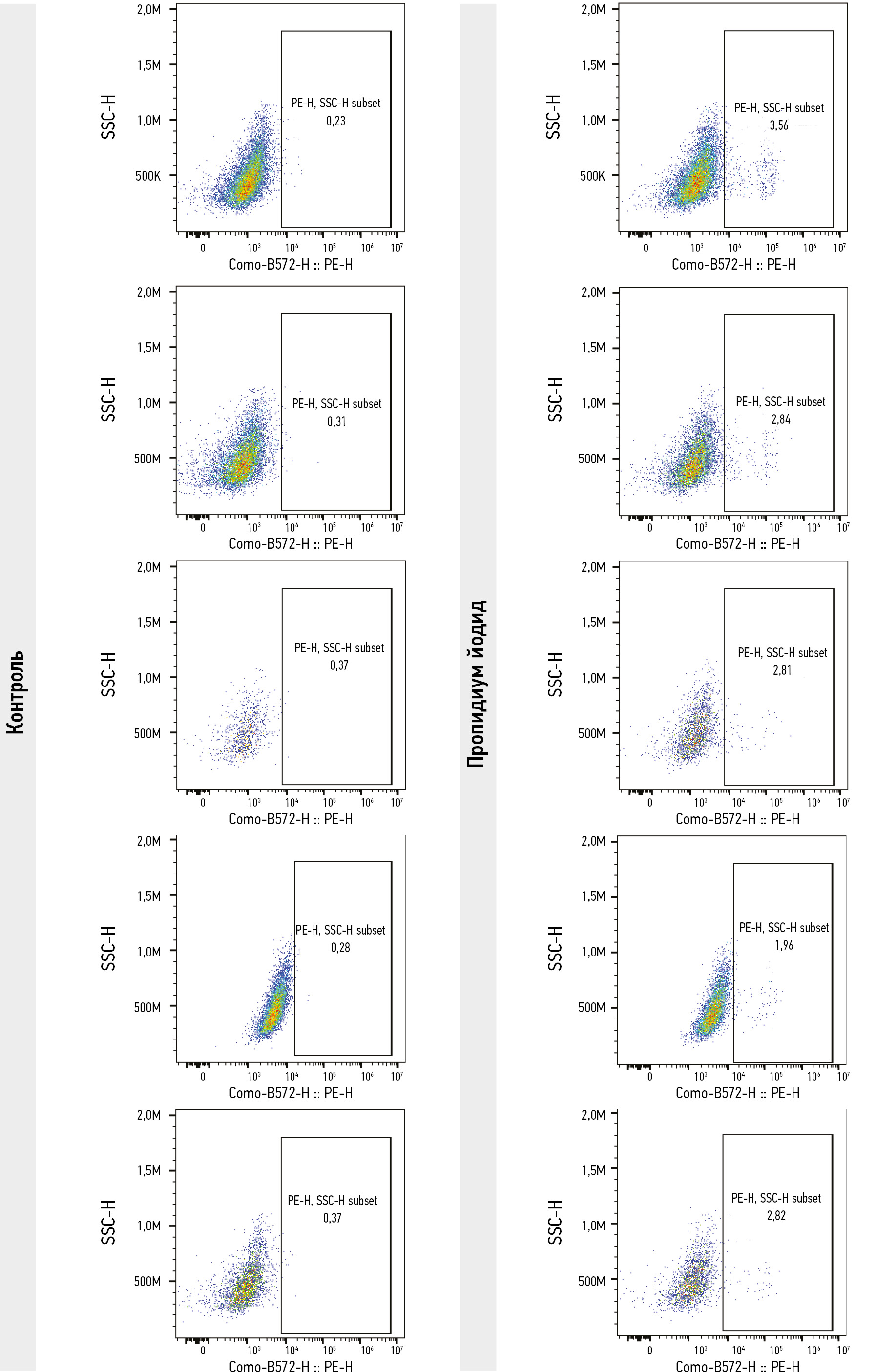 Рис. 4. Оценка процента апоптотических пропидиум йодид положительных клеток линии ТНР-1 (правый столбик) после инкубации клеток с образцами имплантов с покрытием. Левый столбик — контроль окрашивания. SSC-H — боковое рассеяние, PE-H — фикоэритрин.